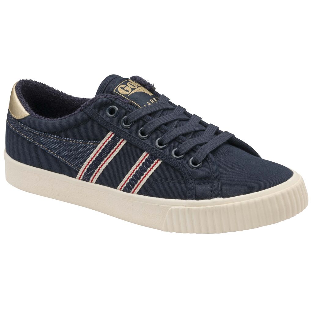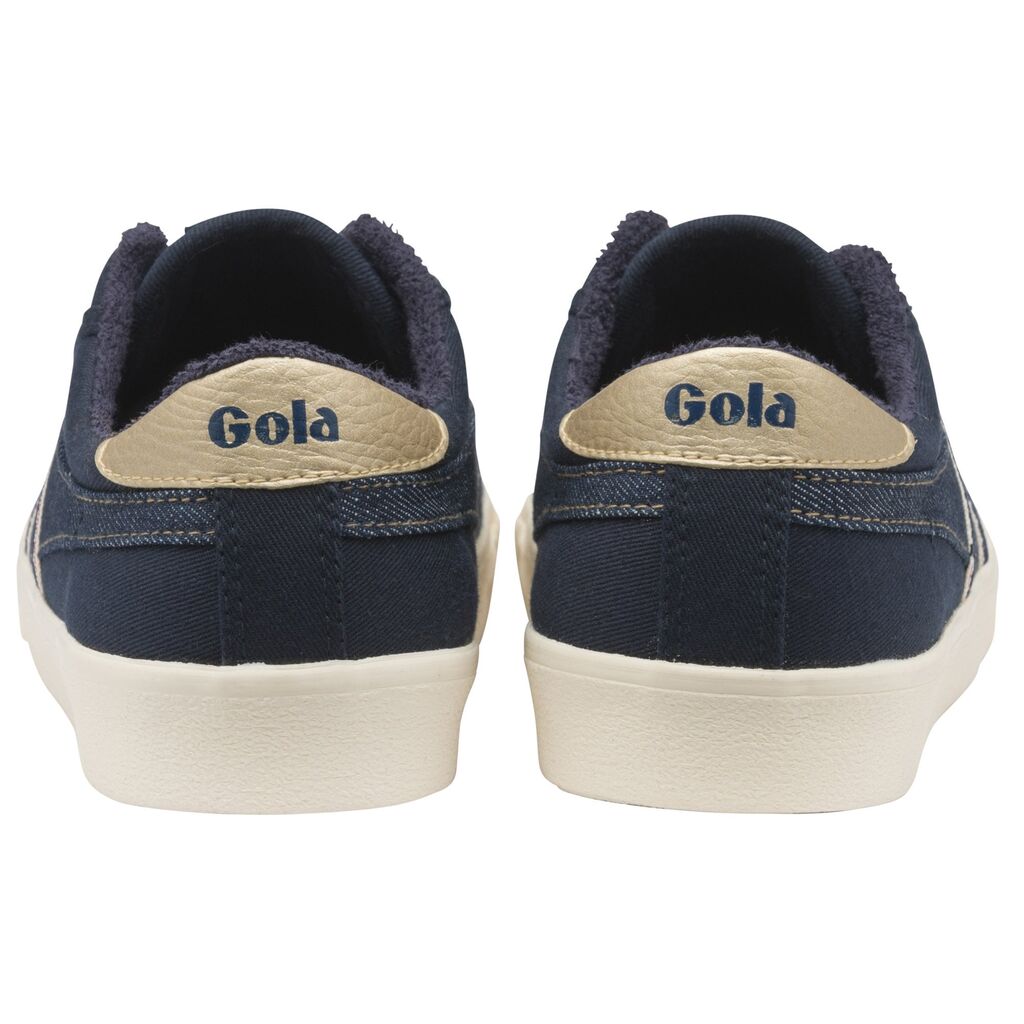 Fitting with the season's re-purposed vintage denim theme, Tennis Mark Cox Selvedge in navy/indigo is a reworked edit of Gola's classic court plimsoll from the '70s. This wardrobe essential fuses a simple navy canvas upper and denim trim with a heritage silhouette, clean lines and a pop of gold to offer a go-to, wear anywhere classic trainer option for women.