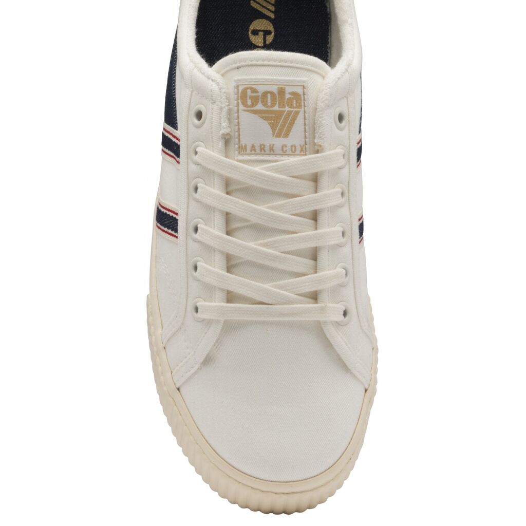 Fitting with the season's re-purposed vintage denim theme, Tennis Mark Cox Selvedge in off white/indigo is a reworked edit of Gola's classic court plimsoll from the '70s. This wardrobe essential fuses a simple off white canvas upper and denim trim with a heritage silhouette, clean lines and a pop of gold to offer a go-to, wear anywhere classic trainer option for women.