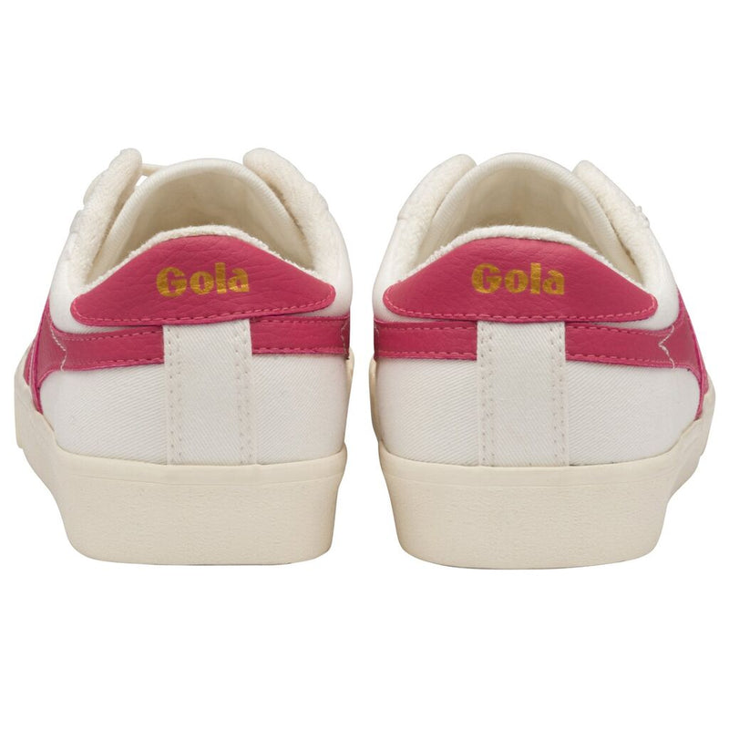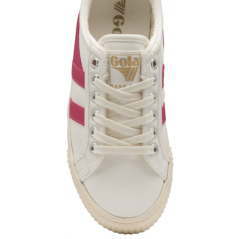 Gola Classics introduces Tennis – Mark Cox. Based on an original Gola style from 1975 that was worn by tennis player Mark Cox, Tennis truly embraces Gola's long history with racquet sports. This ladies tennis inspired plimsoll features an off-white upper, with a contrasting fluro pink wingflash. Gold Gola branding can be seen on the tongue and heel-turn.