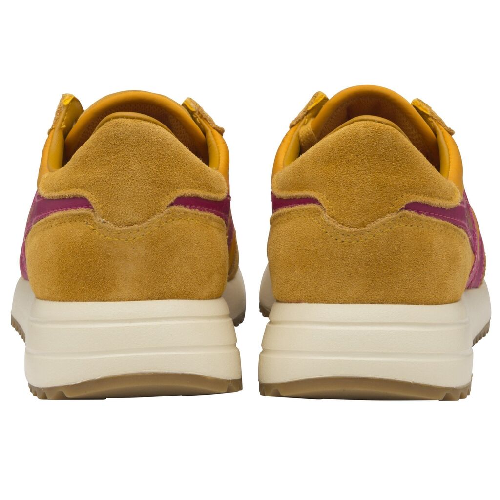 With its exaggerated phylon midsole and cleated gum outsole, Gola women's trainer Vancouver combines comfort and on-trend styling. The nylon upper is finished with self color suede trims and a contrast Gola wingflash with subtle gold Gola branding. Easily suited to styling with skirts or your favourite denim, the sun with fuchsia color combination gives versatility whilst making a season footwear statement.
