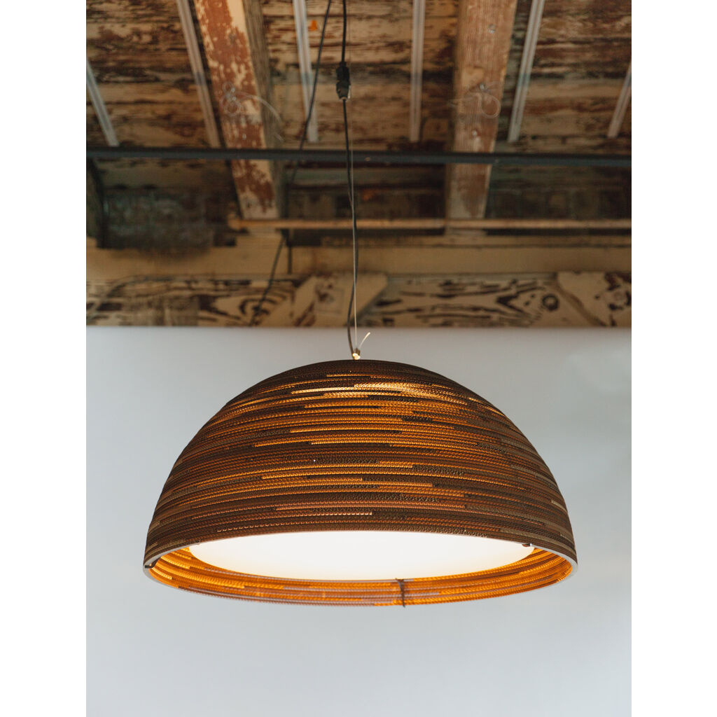 The Dome36 Scraplight Pendant offers an organically shaped design that is handmade from re-purposed corrugated cardboard boxes and features a non-toxic fire retardant treatment. From the Bohemian vault, this up-cycled pendant provides warm and intimate lighting perfect for a variety of decors.