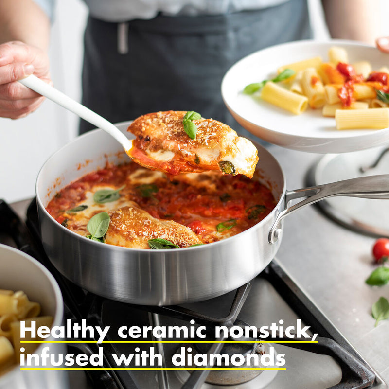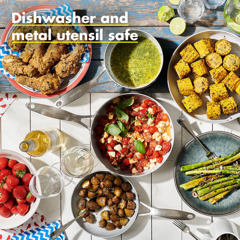 Looking for extra durable cookware with a timeless design, perfect for everyday use? Our GreenPan 7-Piece Cookware Set is an eternal favorite. The multilayer stainless steel body is stylish, handy, and suitable for all cooking surfaces including induction and enforced with Evershine technology, applied to the exterior body of your cookware to avoid discoloration and keep your stainless steel looking new. The interior is coated with Thermolon Minerals Pro, now metal utensil safe and lasts even in the face of intense use and cleaning. Impressed? Wait until you see the trimmed edges to keep your Venice flawless, the riveted stainless steel side handles that allow your cookware to quickly go into the oven and glass lids that are designed for easy food monitoring without losing the heat. This set includes: 10” open frypan, 3qt covered skillet, 5qt covered casserole with 2 spouts and straining lid and 1.5qt covered saucepan.