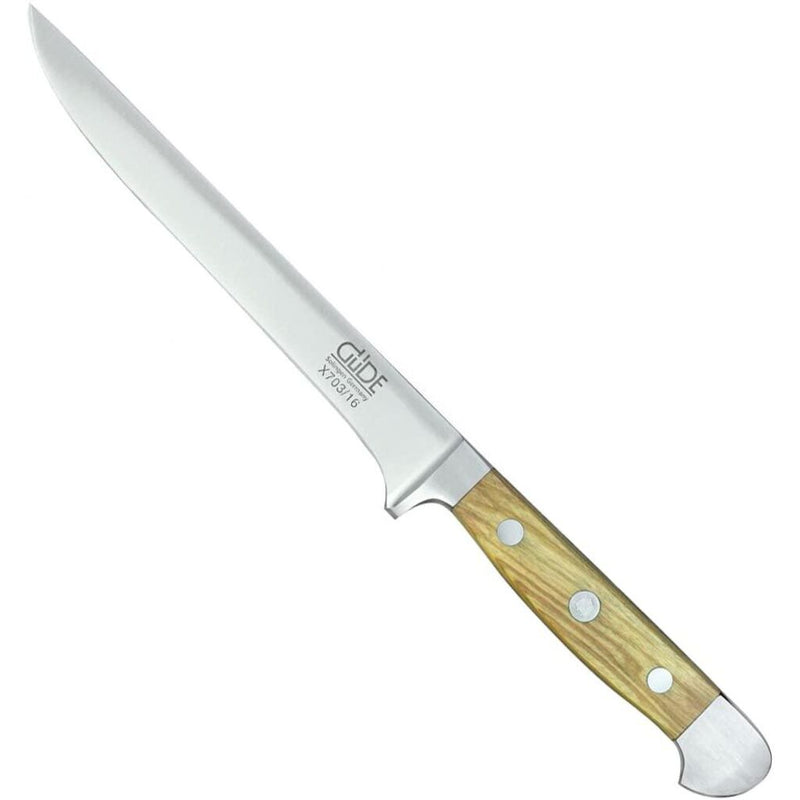DESCRIPTION: The blade of the large Gude Boning Knife X703/16 from the Alpha Olive series is excellently suited for removing bones and skinning and cutting even large pieces of meat or poultry. Tendons and fat can also be removed effortlessly. The blade is hand-ground on both sides, narrow and pointed. It is made of stainless chrome-vanadium-molybdenum steel and allows very precise cuts along the bone and the middle bones.