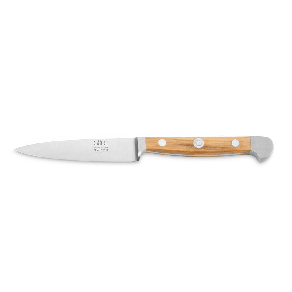 The handles of the Gude Alpha Olive knife series are made of selected olive wood. It comes from Andalusia in Spain and can be up to 500 years old. This type of wood is generally very hard and extremely weatherproof. The structure is strongly grained and therefore looks particularly noble and elegant. The knives of the Alpha Olive series are not dishwasher safe due to its natural material.