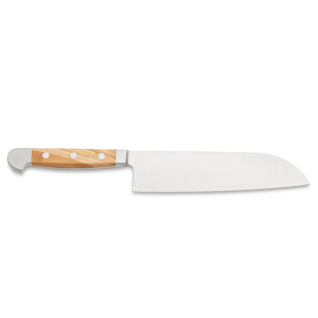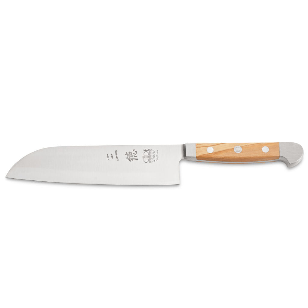 The Alpha Olive Santoku from Gude Solingen is adequate for the European chef's knife. A universal knife that is used in Japanese kitchens for almost all cutting work. In contrast to the European chef knife, it has a wider, straighter blade, which is only slightly rounded at the tip. This is due to the chopping technique preferred in Asia.