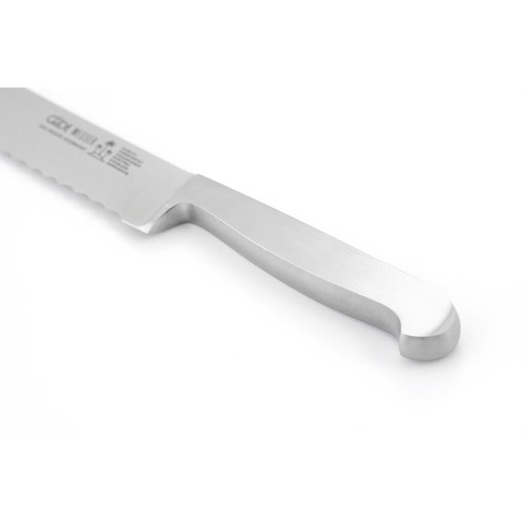 DESCRIPTION: With the Kappa bread knife and its 8 inch long blade, you can cut any bread, hard or soft crusted, into even slices. The one-sided hand-ground blade with the famous Gude serrated edge made of chrome-vanadium-molybdenum knife steel makes bread slicers superfluous.