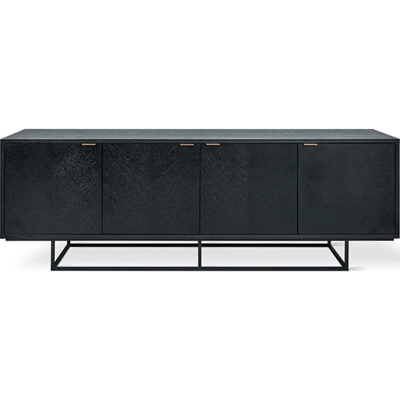 - Features 4 oak doors with rose gold metal pulls and adjustable hinge hardware.