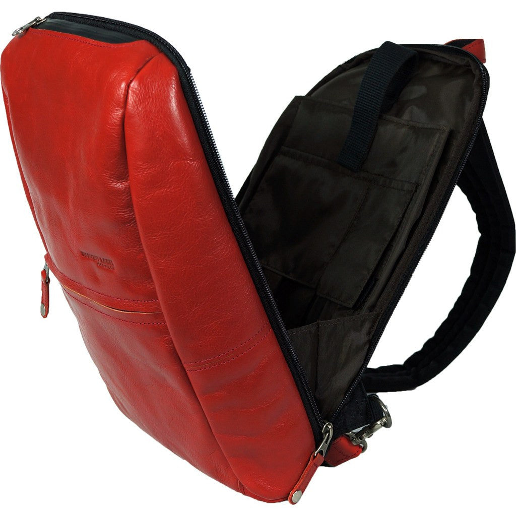 Harvest Label makes a mini version of their Leather Avenue Backpack with this Sling Pack. The Leather Avenue Sling Pack in Red is crafted with genuine Vegetable Tanned Leather features a front zip pocket, multiple interior pockets, a padded tablet sleeve and a unique rear opening design for extra safety.