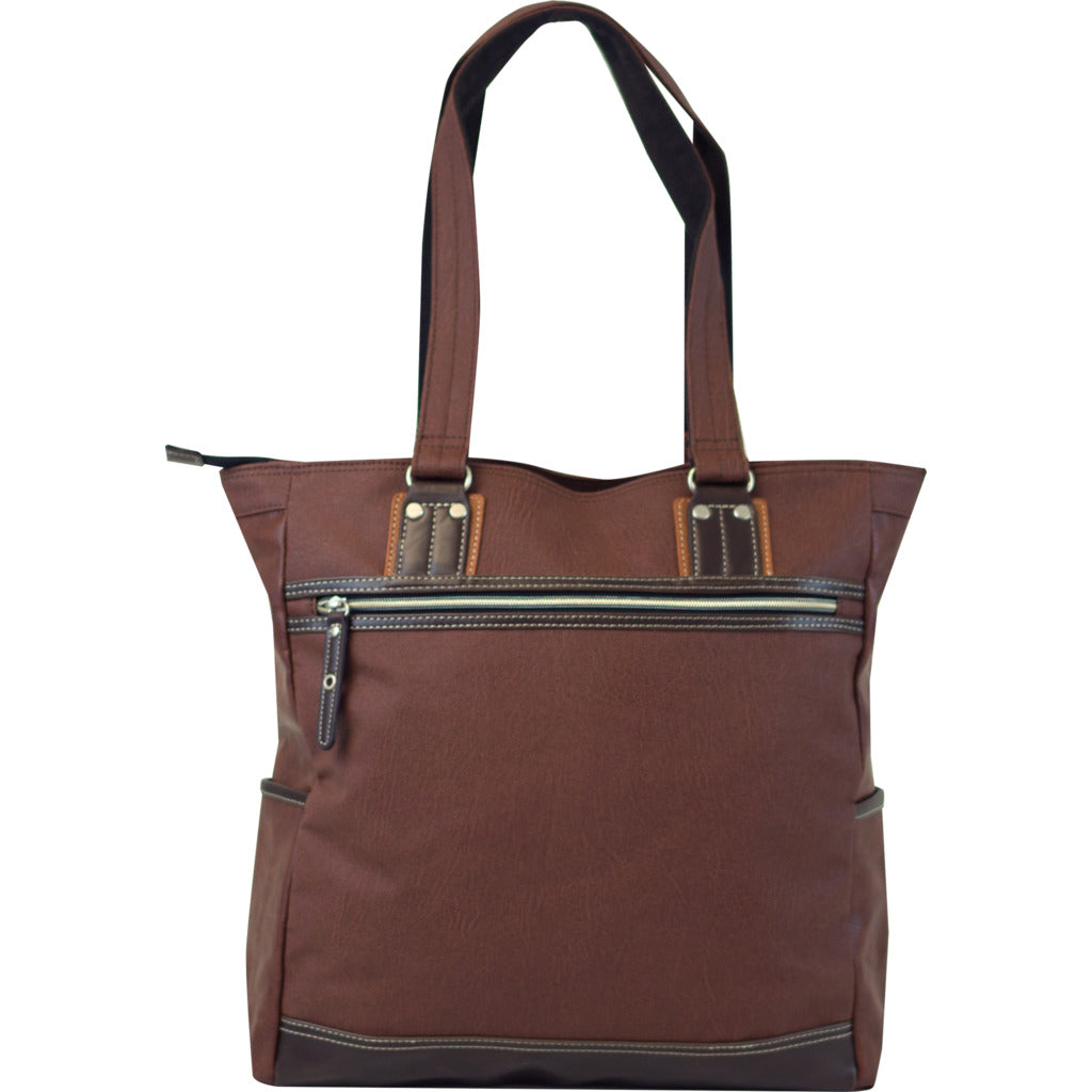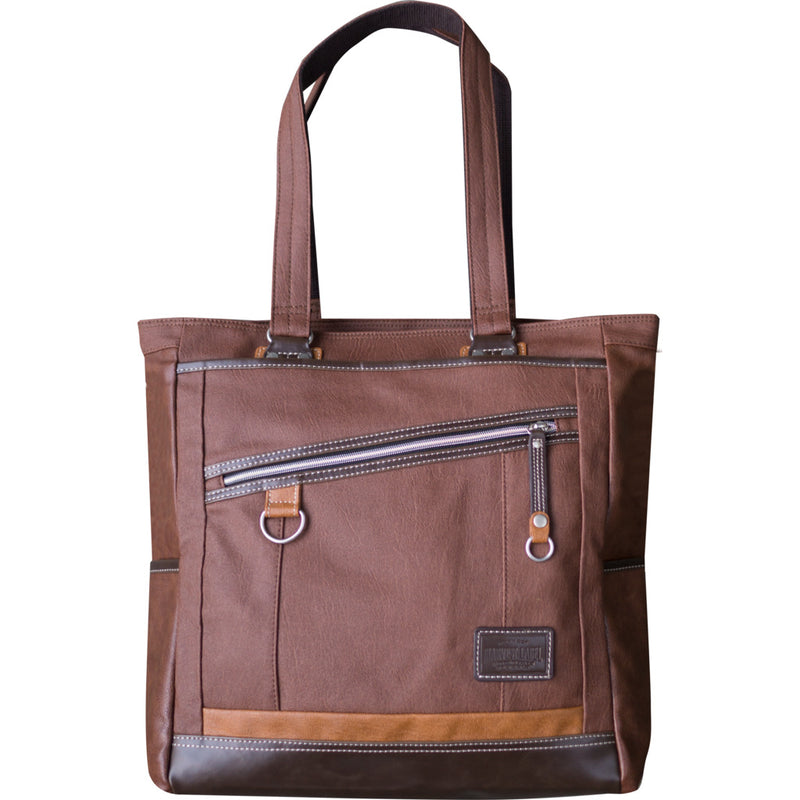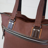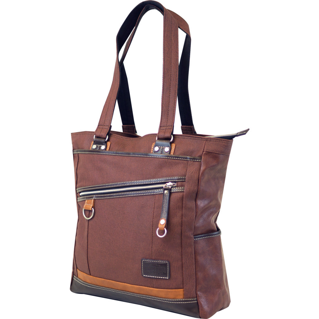 The Vantage Tote in Brown from Harvest Label is a large and versatile bag with zippered pockets for organization and security. Detailed with color stitching, embellished zipper pull, and mixed fabrics for a unique design. Part of the Vantage collection, this bag has a modern & rustic design with a warm & versatile color palette. This stylish tote bag will catch everyone's eye and hold all of your needs. The perfect bag for any weekend getaways!