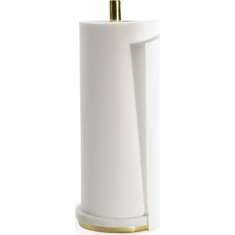 Set on a white circular marble base, with brass details, the Mara Paper Towel Holder is an elevated take on a mundane kitchen necessity. Arm unscrews from base for easy cleaning.