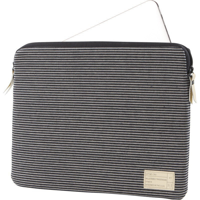 This Hex Convoy Laptop Sleeve is designed for an 11" MacBook Air, but will fit most small laptops up to 11". The exterior is constructed from water resistant, waxed canvas, with black coated trim and features a padded and fleece-lined storage compartment with genuine leather zipper pulls.