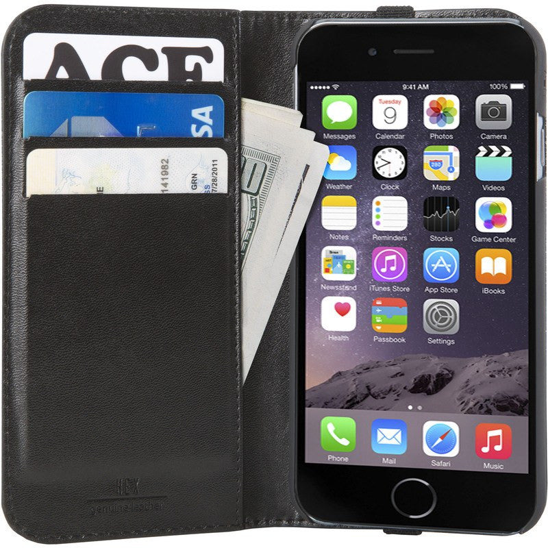The Hex Icon Wallet for iPhone 6 incorporates a slim, modern profile with several design directives effectively establishing the gold standard for iPhone wallet cases. Their custom molded phone bed is reinforced for strength then wrapped with premium genuine leather for a solid look and feel. When closed, the cover is held in place by an elastic closure, providing protection for both your phone and your valuables. When open, the Icon boasts three card slots for ID or credit cards as well as an additional cash pocket tucked behind the card slots. Recommended for one card per slot.