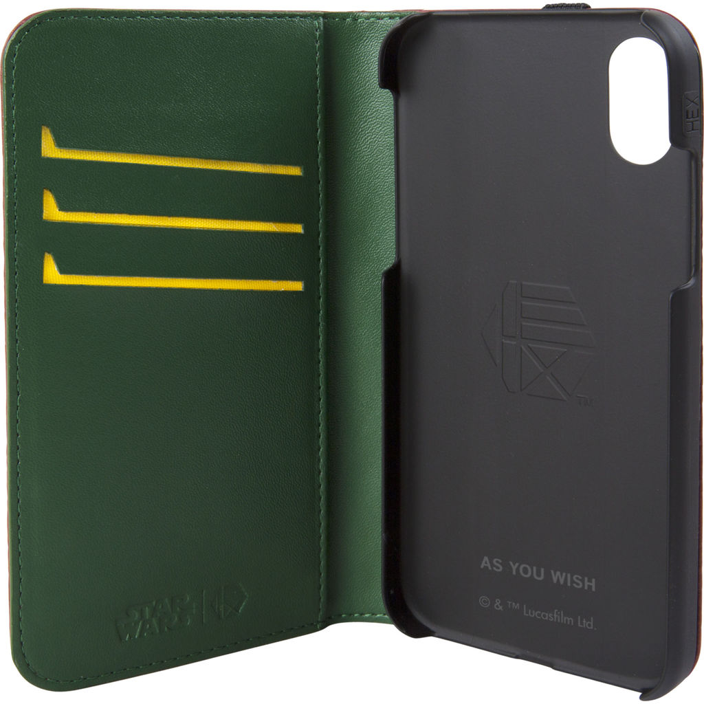 The Hex Star Wars Wallet Case in Boba Fett Burgundy Emboss for iPhone X incorporates a slim, modern profile with several design directives effectively establishing the gold standard for iPhone wallet cases. Feel the force with you with this limited edition Star Wars case. Protect your phone with their standard custom molded phone bed that is reinforced for strength then wrapped with premium genuine leather for a solid look and feel. When closed, the cover is held in place by an elastic closure, providing additional protection for both your phone and your valuables. When open, the case boasts three card slots for ID or credit cards as well as an additional cash pocket tucked behind the card slots.