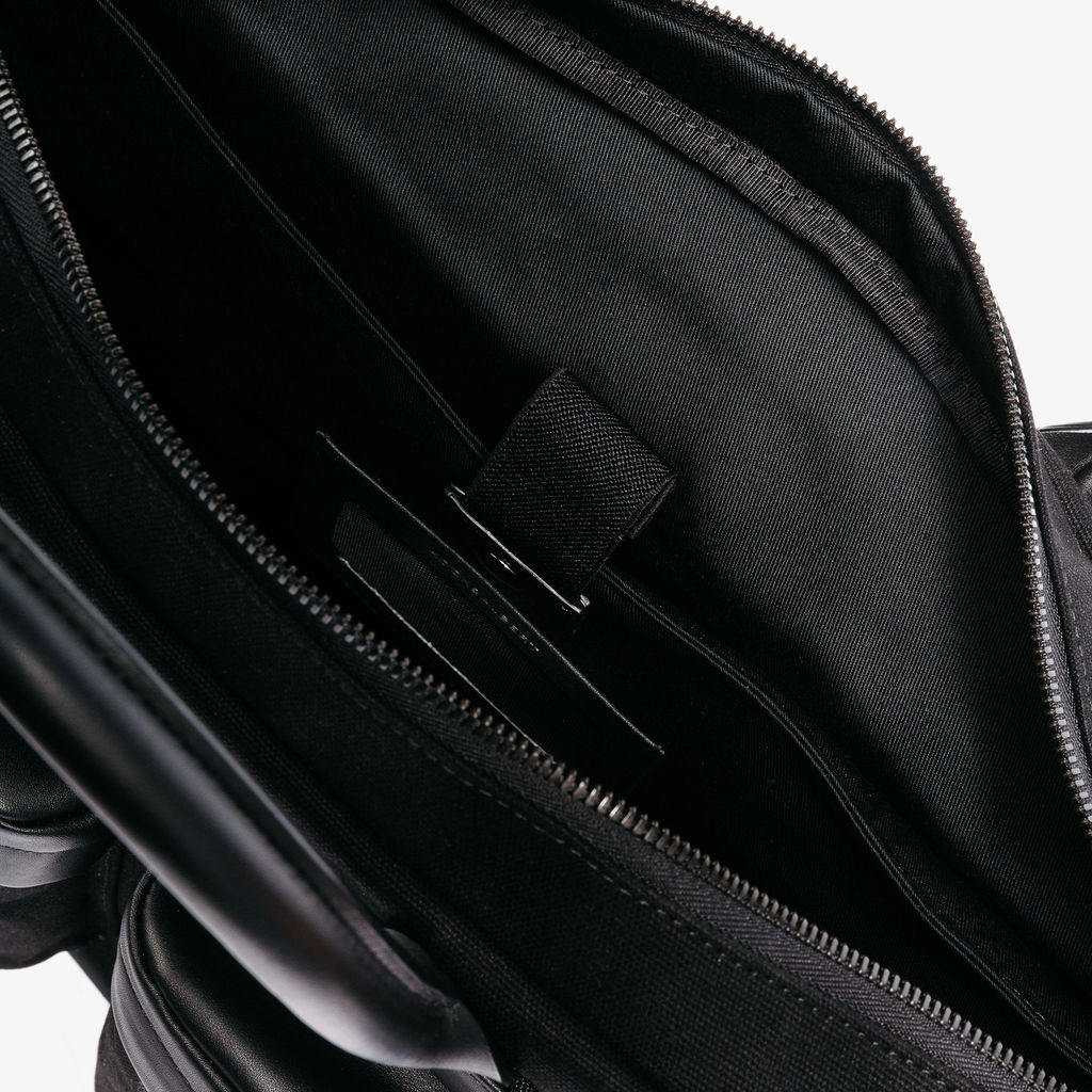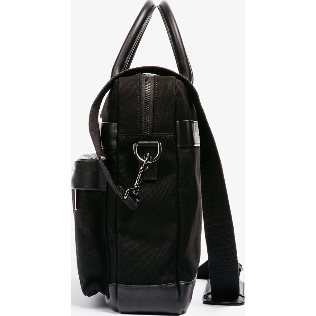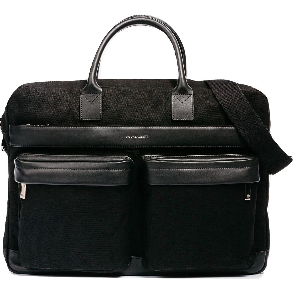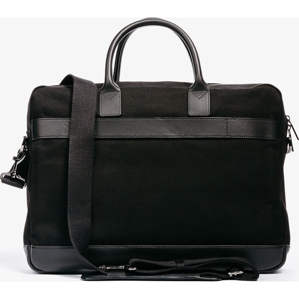 Crafted to meet your life's needs inside or outside the city, the Black Casual Canvas Briefcase from Hook + Albert has an exterior made from black canvas with top grain leeather accents. All of this bag's hardware is customized and branded to add utility in addition to refined style. Boasting spacious storage despite its compact size, the Canvas Casual Briefcase has five exterior pockets, a padded laptop sleep, and numerous interior storage compartments. To make travel as seamless as possible, Hook + Albert has outfitted this briefcase with a strap on the back side that allows it to be secured to roller luggage.