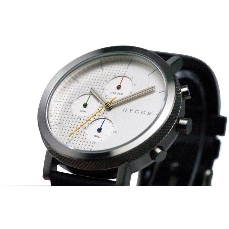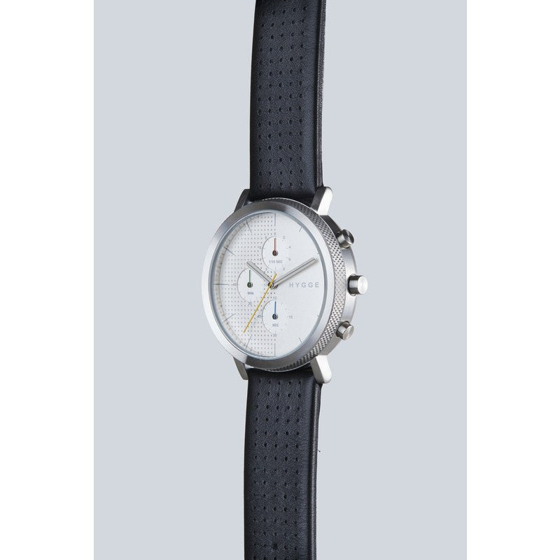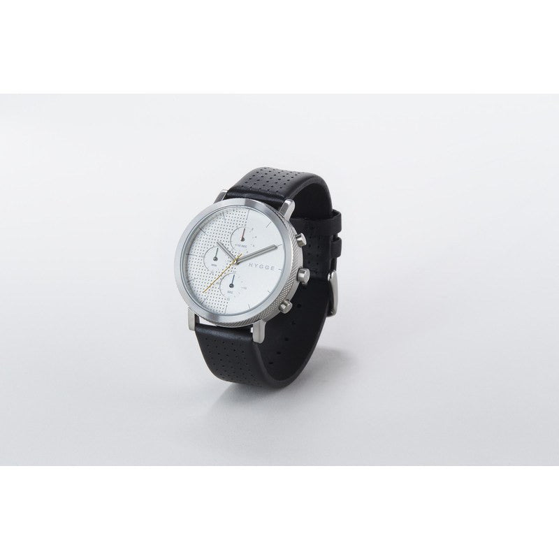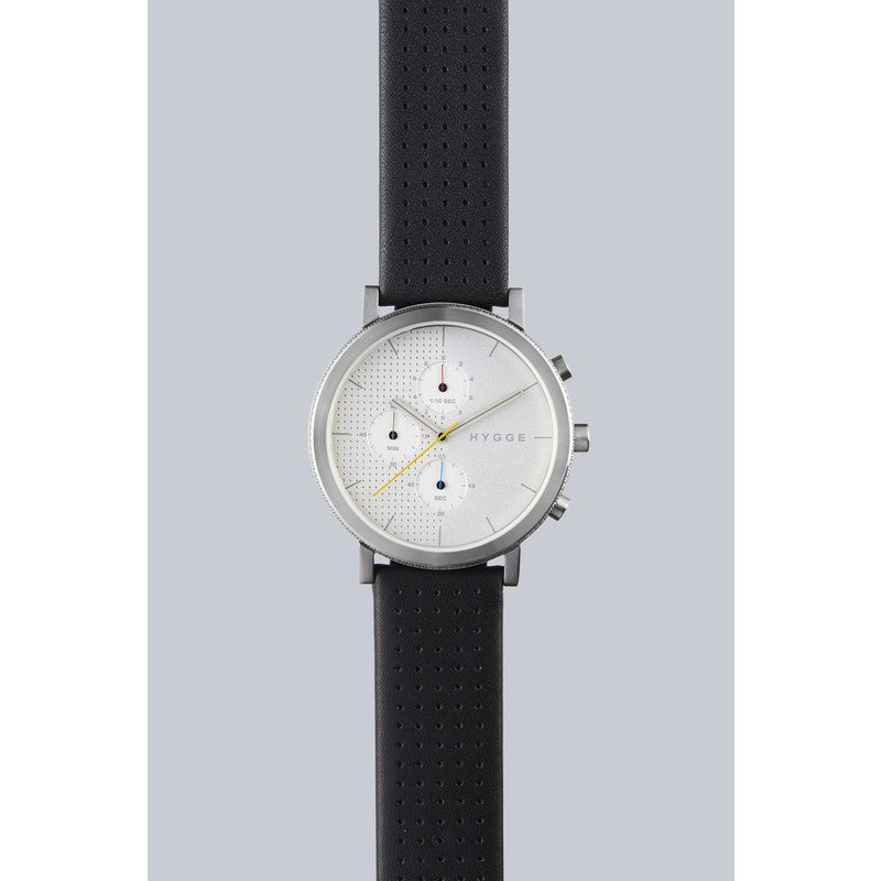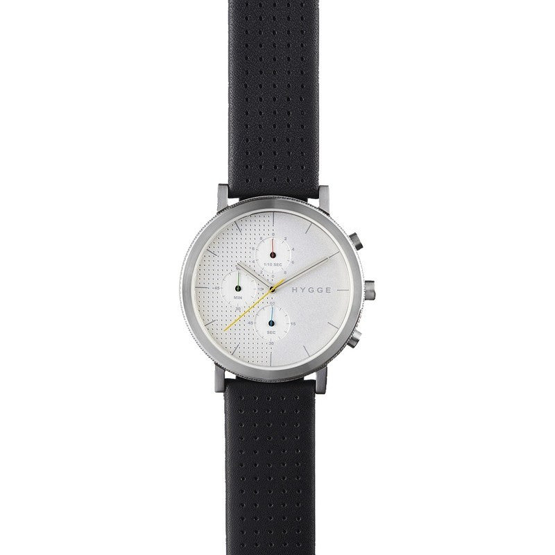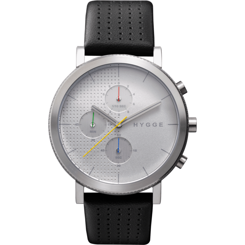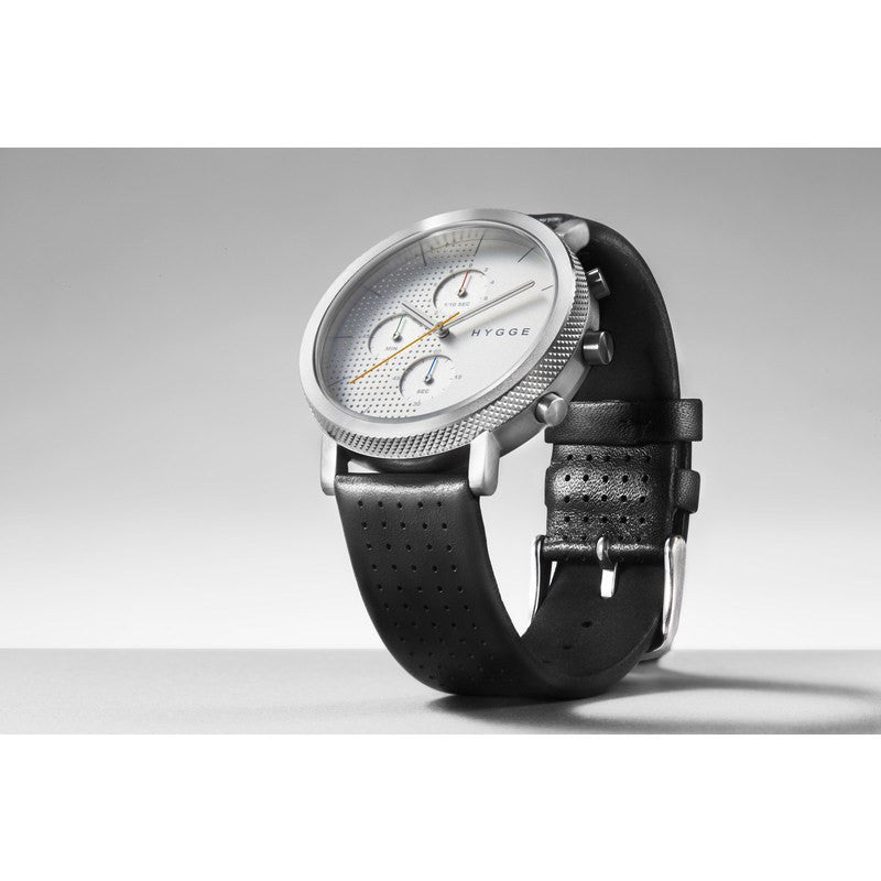The 2204 Watch represents the very expression of Hygge, a minimalist Scandinavian Designed, quality chronograph watch. Highlighted by its diamond-pattern case side, the Hygge 2204 reflects the façade of the architectural Taastrup Theater. Design and quality, the know-how of Hygge is emphasized by a unique dial: a mixture of design originality (Left half with holes) and quality (double-layer dial). Preserving the essence of Scandinavian modern design, this chronograph series is nonetheless a tribute to the brand and its past collections with the minimal use of colors and a yellow touch.