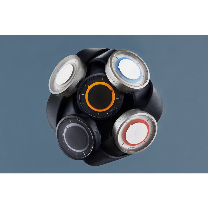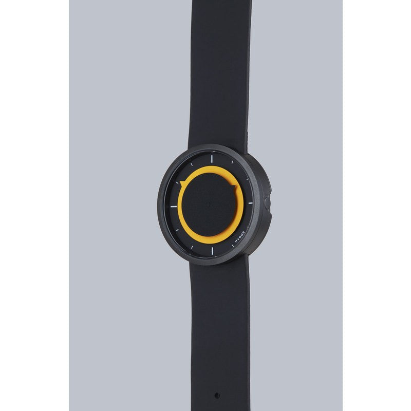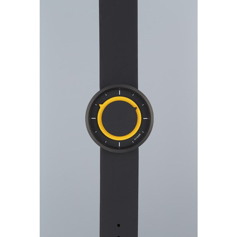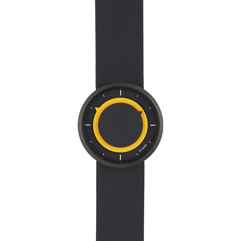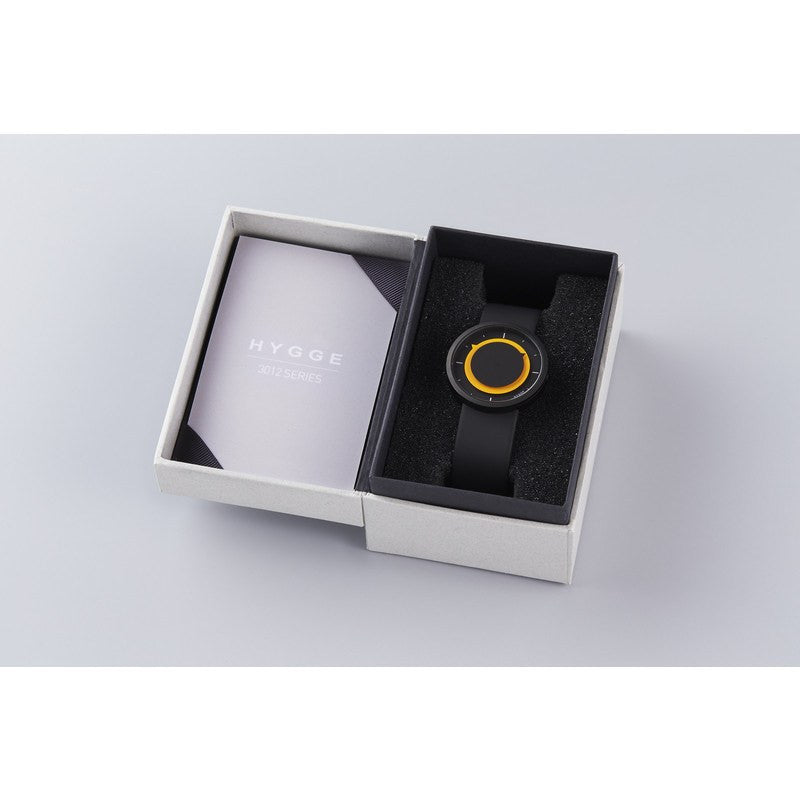 The Hygge 3012 Watch re-imagines the perception of time utilizing two rotating discs to distinguish the hour and minute. While carefully detailed, the 3012 features a simplified stainless steel case providing a calm viewing surrounding. Exceptional quality is expected from the manufacturing process to materials and mechanical design, all of which have been chosen with care to provide a product that is comfortable, functional and durable in use. The design process started from the basic watch face with the goal of finding a user-friendly and unique way to represent time. The result is a simple, functional and aesthetic product where each design detail has been crafted to highlight the display. The logic of the watch face is simple; the bottom disk indicates the hour and the top disk the minutes.