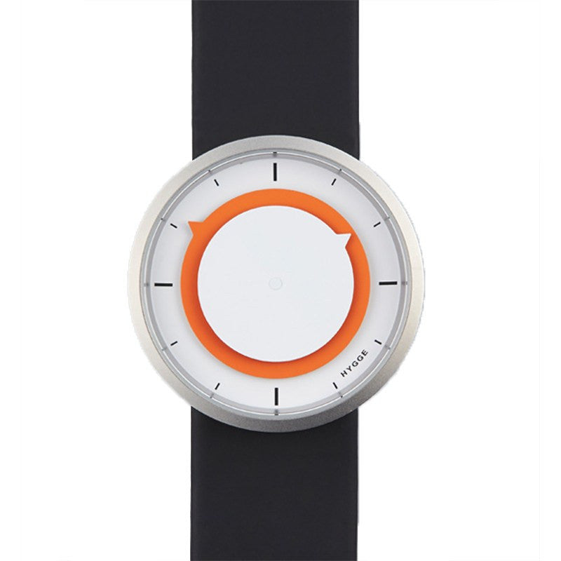 The Hygge 3012 Watch re-imagines the perception of time utilizing two rotating discs to distinguish the hour and minute. While carefully detailed, the 3012 features a simplified stainless steel case providing a calm viewing surrounding. Exceptional quality is expected from the manufacturing process to materials and mechanical design, all of which have been chosen with care to provide a product that is comfortable, functional and durable in use. The design process started from the basic watch face with the goal of finding a user-friendly and unique way to represent time. The result is a simple, functional and aesthetic product where each design detail has been crafted to highlight the display. The logic of the watch face is simple; the bottom disk indicates the hour and the top disk the minutes.