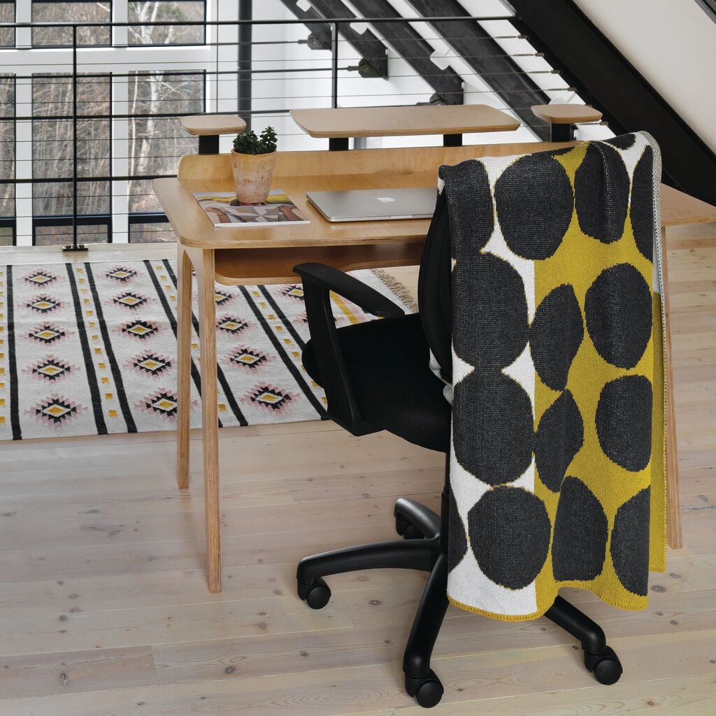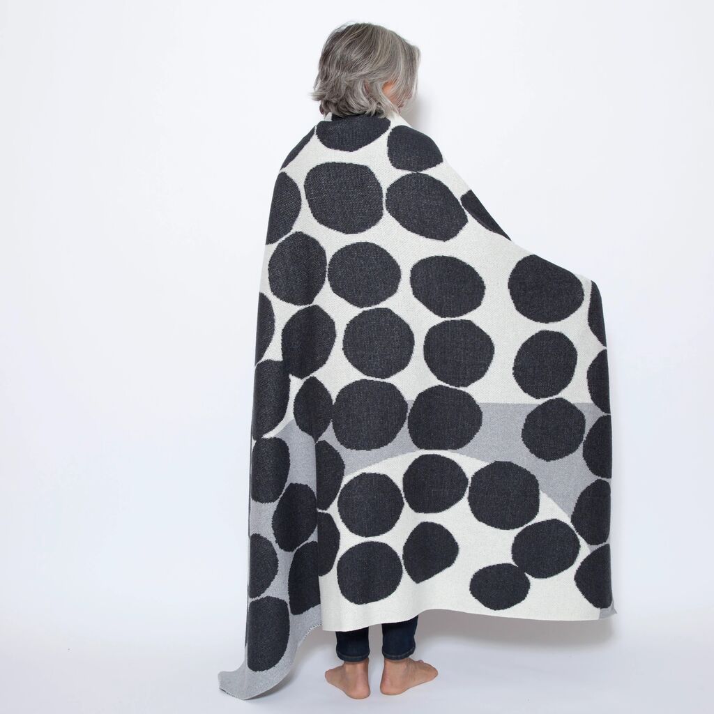 Inspired by our favorite day of the week, Saturday Green is a new collection of sustainable, modern throws designed in collaboration with women artists and made in the U.S.A. Boston-based Susy Pilgrim Waters is an award-winning illustrator with a passion for textiles and surface design. This design with its unsymmetrical pattern and jaunty painterly dots has a lithographic hand-drawn quality. Susy’s designs translate effortlessly to our sustainable cotton throws.