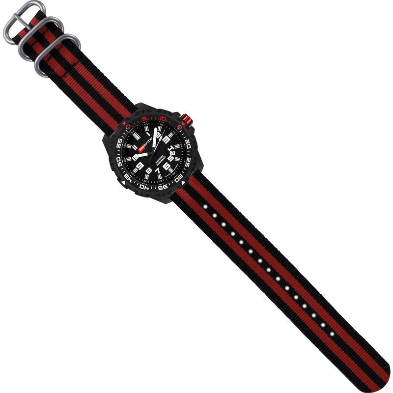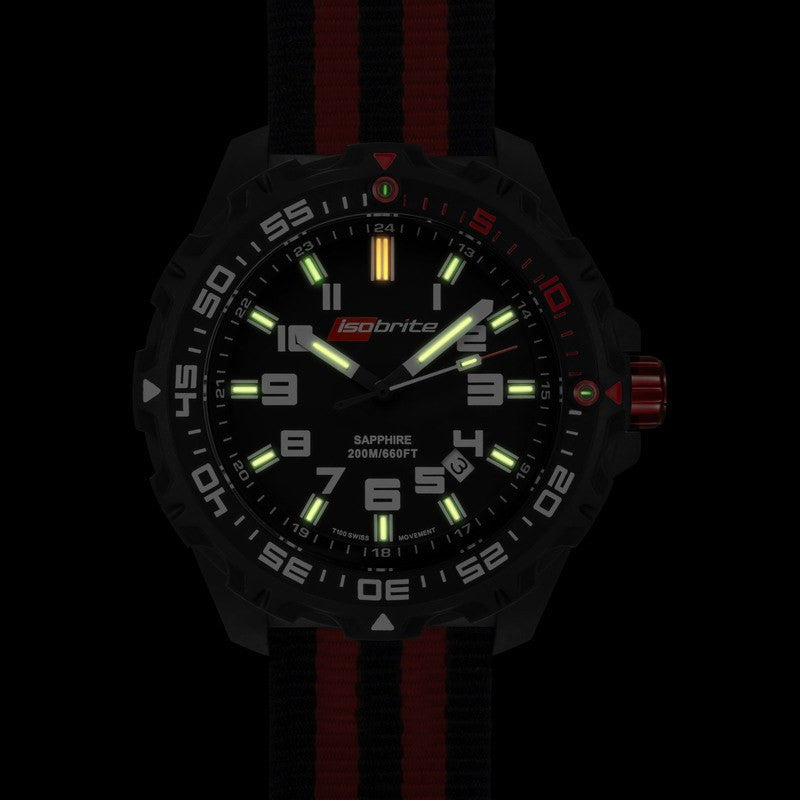 Isobrite is the world's first T100 tritium illuminated lightweight polycarbonate watch. Unlike ordinary tritium watches that use T25 tritium illumination, the Isobrite watch uses ultra bright T100 tritium illumination. This makes it 4 times brighter than the competition. The Limited Concept in Black-Black-Red features an all black face, bezel and case, white contrast numbers, and green with orange tritium illumination on a striped nylon band.