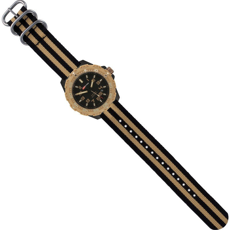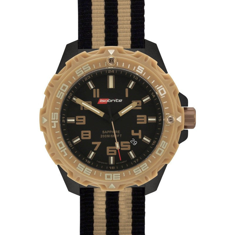 Isobrite is the world's first T100 tritium illuminated lightweight polycarbonate watch. Unlike ordinary tritium watches that use T25 tritium illumination, the Isobrite watch uses ultra bright T100 tritium illumination. This makes it 4 times brighter than the competition. The Limited Concept in Tan-Black features a tan bezel on a black face and case, tan numbers, with green and orange tritium illumination on a striped nylon band.