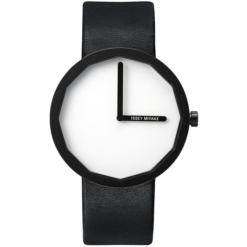 The Twelve white face and black outer ring watch for Issey Miyake by Naoto Fukasawa was designed to be as simple and strong as possible. The Twelve design eliminates all markings, even numbers, from the face. Instead, the crystal face takes on the twelve sides of a dodecagon, each of the twelve angles serving as the hour makers. The leather band for this men’s watch is installed underneath and around the disk. This designer men’s watch for Issey Miyake and created by Naoto Fukasawa is a fabulous wristwatch with the minimal in mind.
