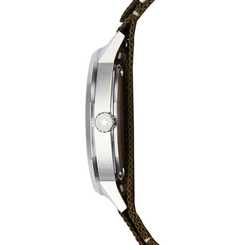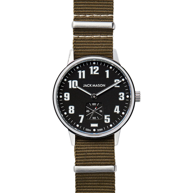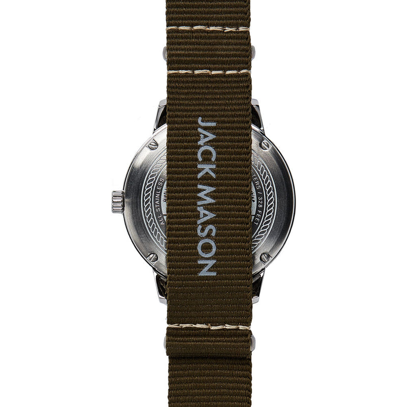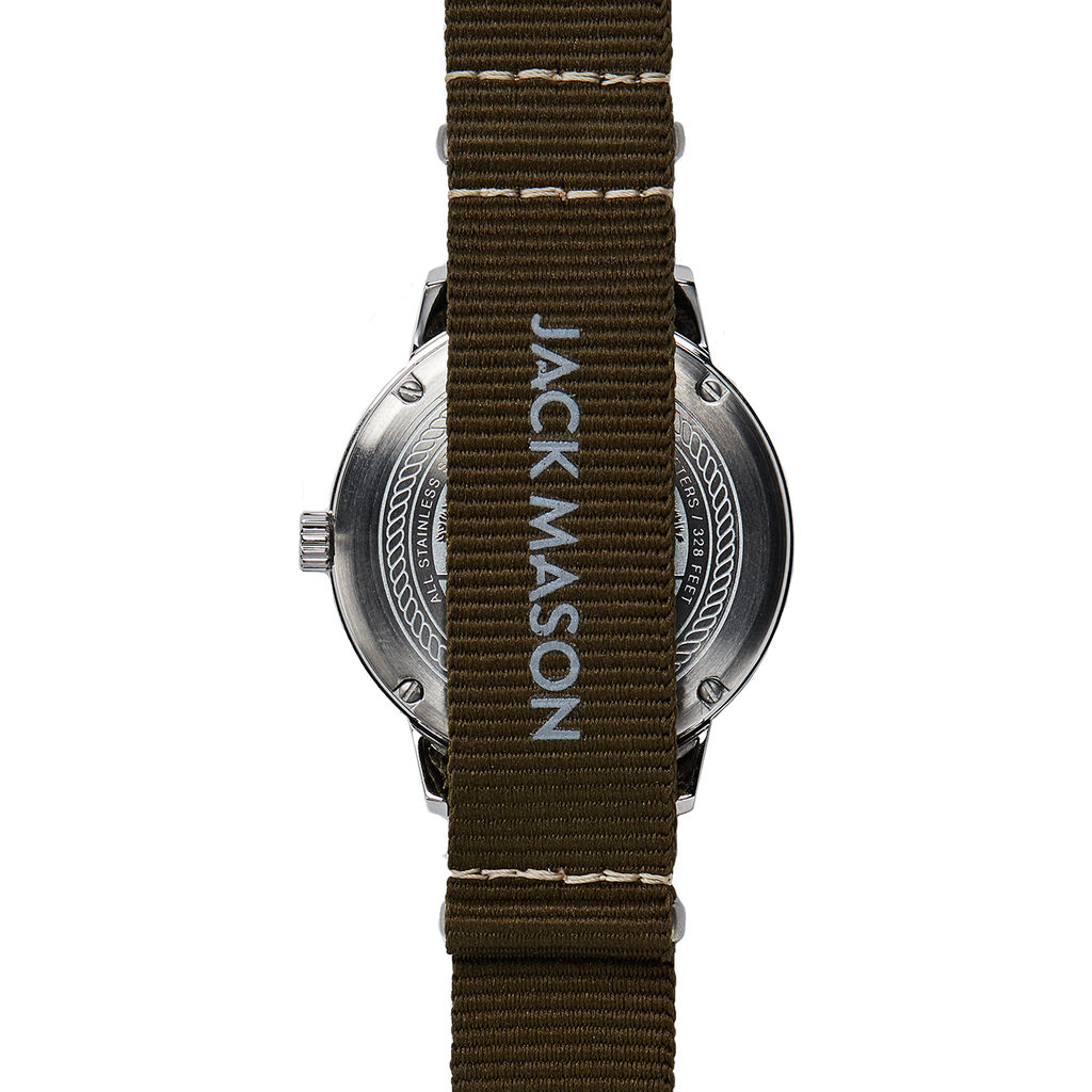 With a pared down case size and understated design elements, the 38 mm Camp Watch boasts the iconic nature of a field watch. A sleek black dial paired with SuperLuminova markings creates a stark contrast in addition to easy-to-read functionality. The Camp Watch's polished stainless steel casing adds just a touch of modern design, while the military inspired olive Nylon strap maintains a rugged character. Like all Jack Mason Timepieces, this wristwatch accommodates interchangeable straps (18 mm) to offer a versatile performance that conforms to your active lifestyle.