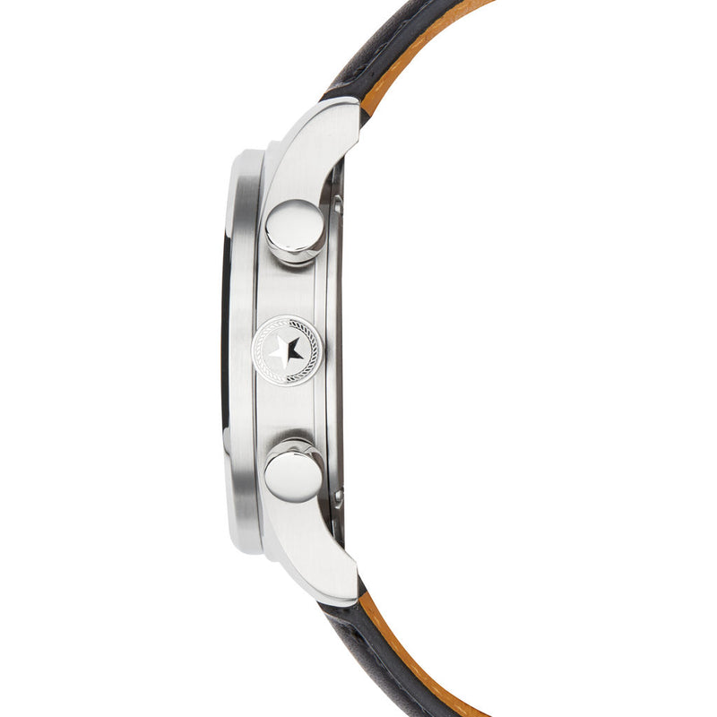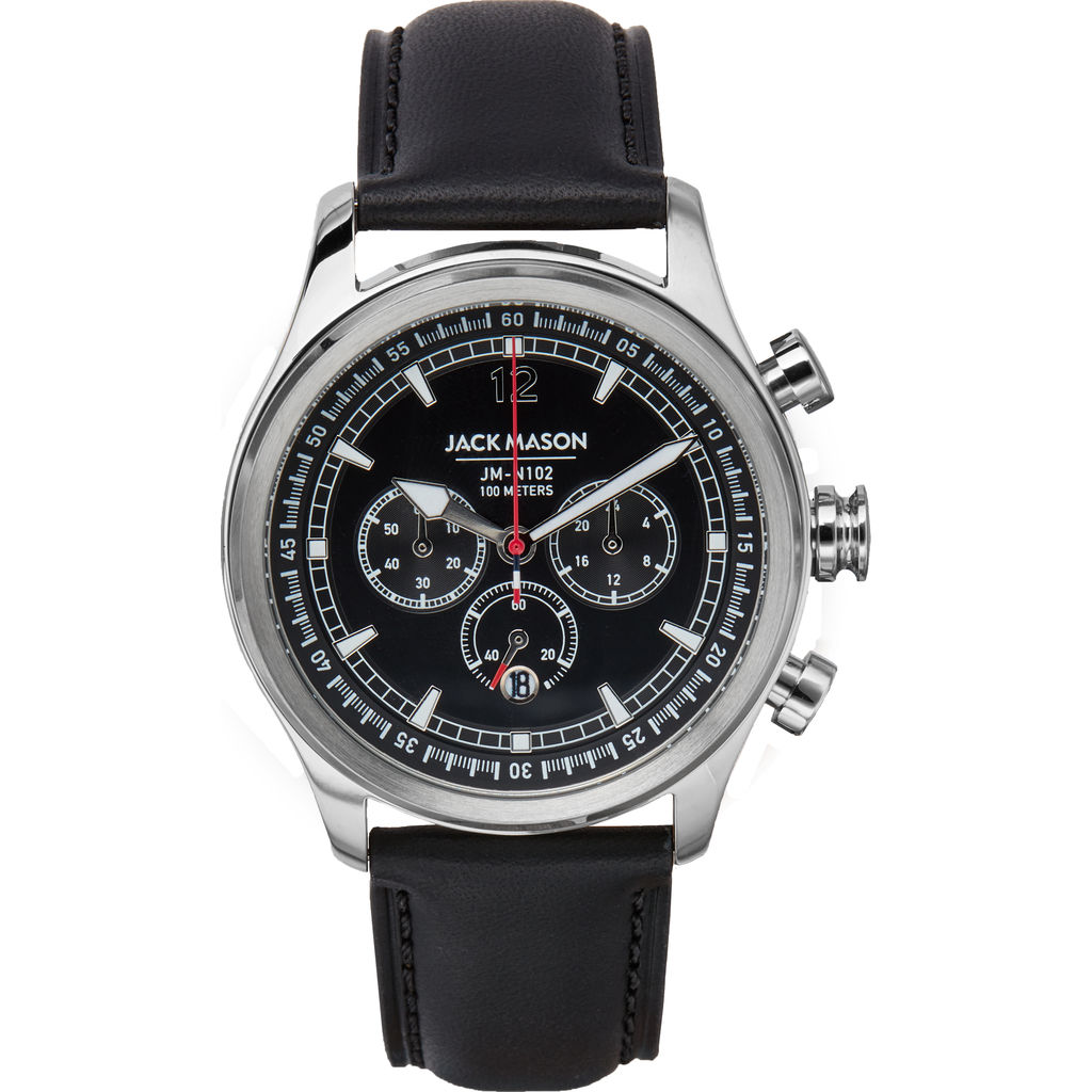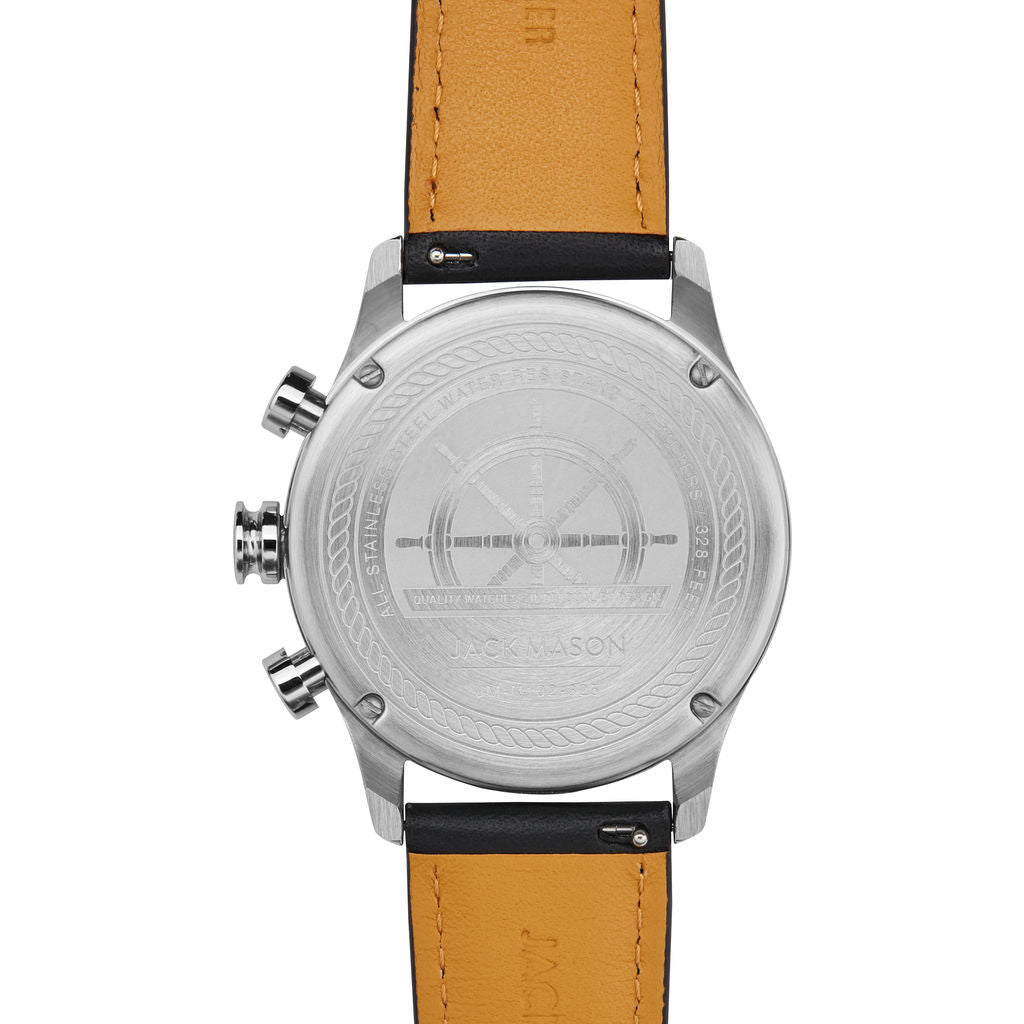 Inspired by nautical instruments, the Stainless Steel Jack Mason Nautical Chronograph features Super Luminova markings for clear readability, even in low lighting situations. Jack Mason paid particular attention to the face details, with subtle white, red, and blue markings along the second hand, paying homage to the American flag. This model features a black dial paired with a black leather band for a clean, classic look.