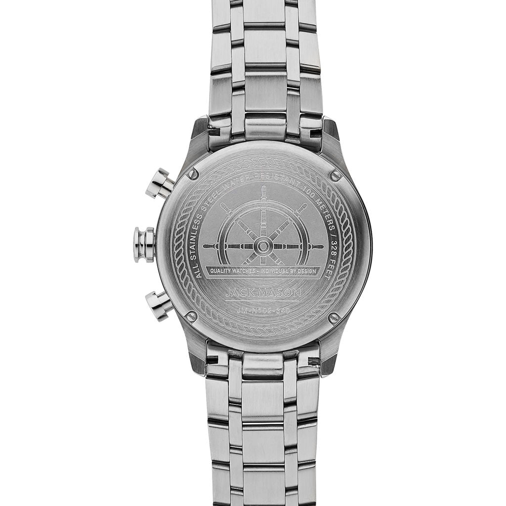 Inspired by nautical instruments, the Stainless Steel Jack Mason Nautical Chronograph features Super Luminova markings for clear readability, even in low lighting situations. Jack Mason paid particular attention to the face details, with subtle white, red, and blue markings along the second hand, paying homage to the American flag. This model features a black dial paired with a stainless steel band for a clean, classic look.