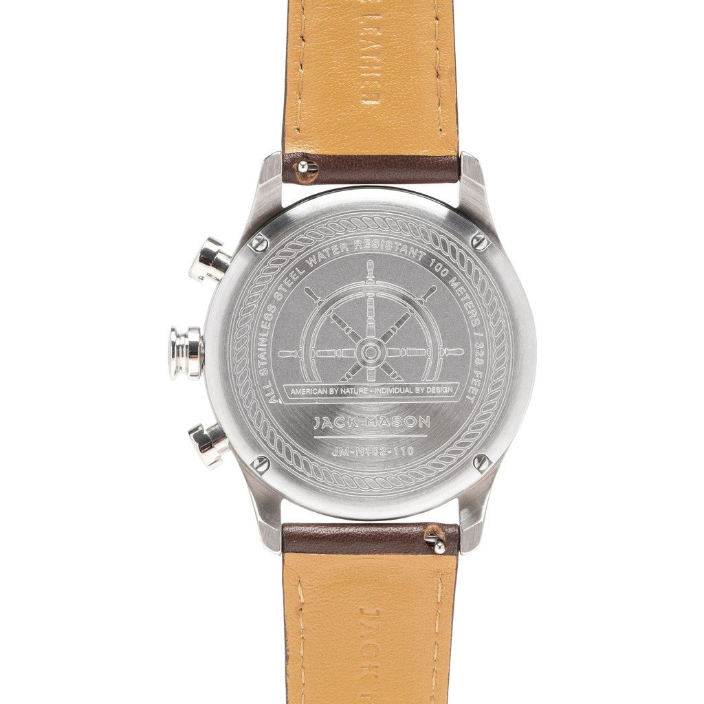 Inspired by nautical instruments, Jack Mason's Nautical JM-N102-110 Chronograph Watch features Super Luminova markings for clear readability, even in low lighting situations. Jack Mason paid particular attention to the face details, with subtle white, red, and blue markings along the second hand, paying homage to the American flag. This model features a white dial paired with a brown leather band for a clean, classic look.
