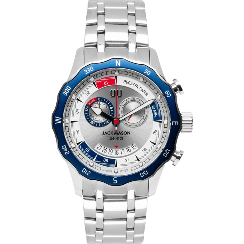 The Navy and Steel Regatta Timer Yacht Watch is a beautiful design from Jack Mason. It features yacht Timer Movement, a sapphire crystal face and a steel wrist band. This chronograph watch is a durable and stylish choice for anyone who needs a rugged watch that can keep up with them. You won't have to worry about water with a steel wrist band and water resistance up to 20 atm. You will not disappoint with this time piece.