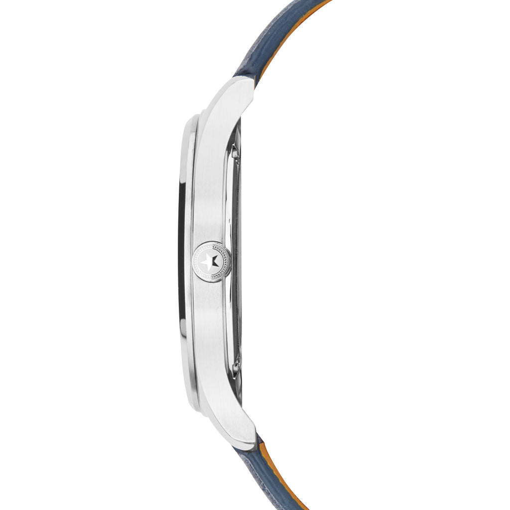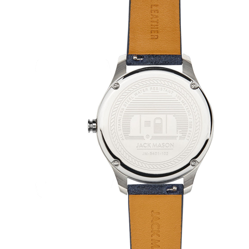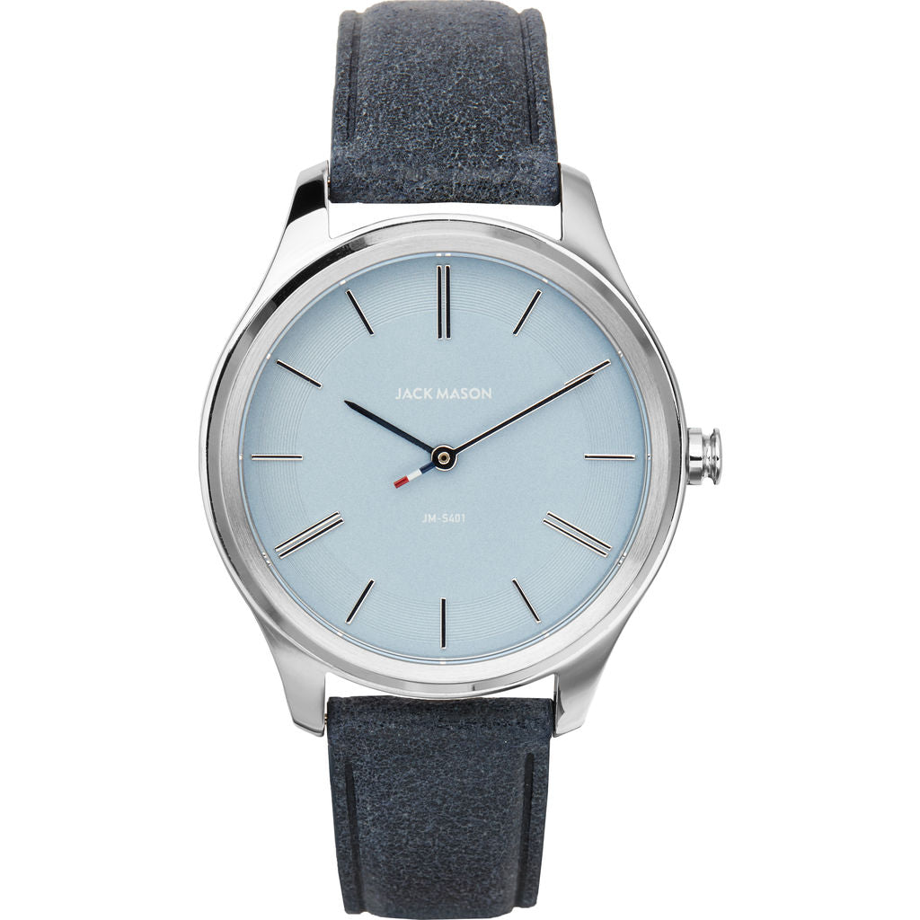 A modern minimalist silhouette is met with classic styling to bring you the Powder Blue Slim Watch from Jack Mason. Drawing its influence from the renown Jack Mason Nautical collection, a slim casing pairs with oversized numbers at the 12, 4, and 8 positions, creating an aesthetic that incorporates timeless and contemporary design. An interchangeable lamb leather strap completes this Jack Mason Timepiece.