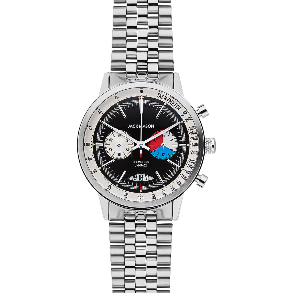 Paying homage to the intrinsically adventurous nature of the chronograph, Jack Mason's new Racing Watch Collection juxtaposes the old with the new. Complete with a striking stainless steel band, the 40mm Chrono boasts bold features which draw from both the interior and exterior design elements of mid-century sports cars. Every last detail was chosen to honor time and speed.
