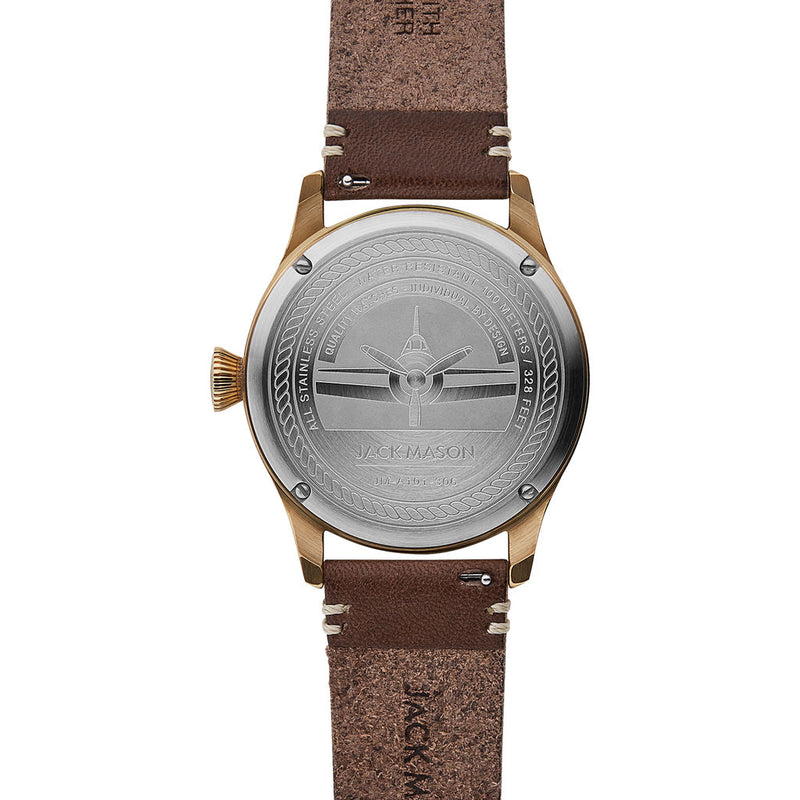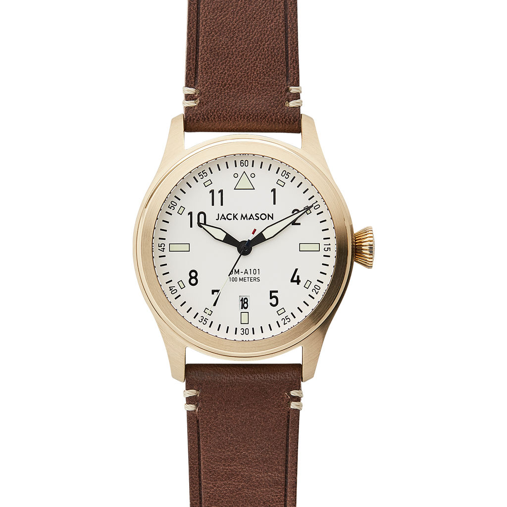 A casual nod to the classic pilot’s watch, Jack Mason's Aviator Watch 42mm combines a white dial with vintage lum and traditional dial features. The raw edge natural Italian leather straps compliment the stainless steel case. The 42mm case is compatible with our 22mm straps when you want to add a Nylon strap for a pop of color. Subtle details, colors, and texture adds an update to the classic style without compromising the utility of the original pilot’s watch. Comfortable for everyday wear and features an easy-to-read dial with SuperLuminova markings and applied indices on a 42mm for your new favorite timepiece.