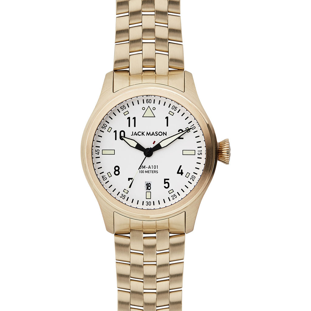 A casual nod to the classic pilot’s watch, Jack Mason's Aviator Watch 42mm combines a white dial with vintage lum and traditional dial features. The 42mm case is compatible with our 22mm straps when you want to add a Nylon strap for a pop of color. Subtle details, colors, and texture adds an update to the classic style without compromising the utility of the original pilot’s watch. Comfortable for everyday wear and features an easy-to-read dial with SuperLuminova markings and applied indices on a 42mm for your new favorite timepiece.