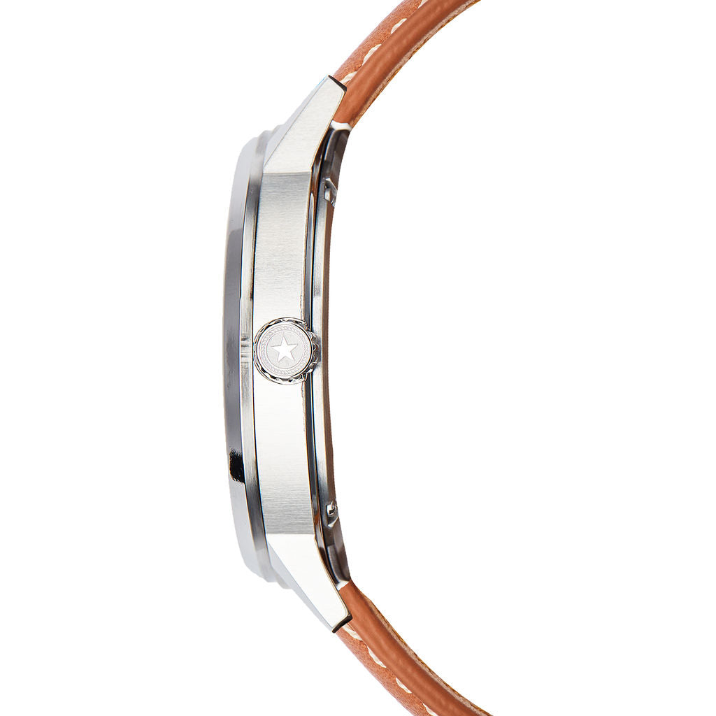 With a pared down case size and understated design elements, the 38 mm Camp Watch boasts the iconic nature of a field watch. A sleek white dial paired with SuperLuminova markings creates a striking contrast in addition to easy-to-read functionality. The Camp Watch's polished stainless steel casing adds just a touch of modern design, while the genuine leather strap maintains a rugged character. Like all Jack Mason Timepieces, this wristwatch accommodates interchangeable straps (18 mm) to offer a versatile performance that conforms to your active lifestyle.