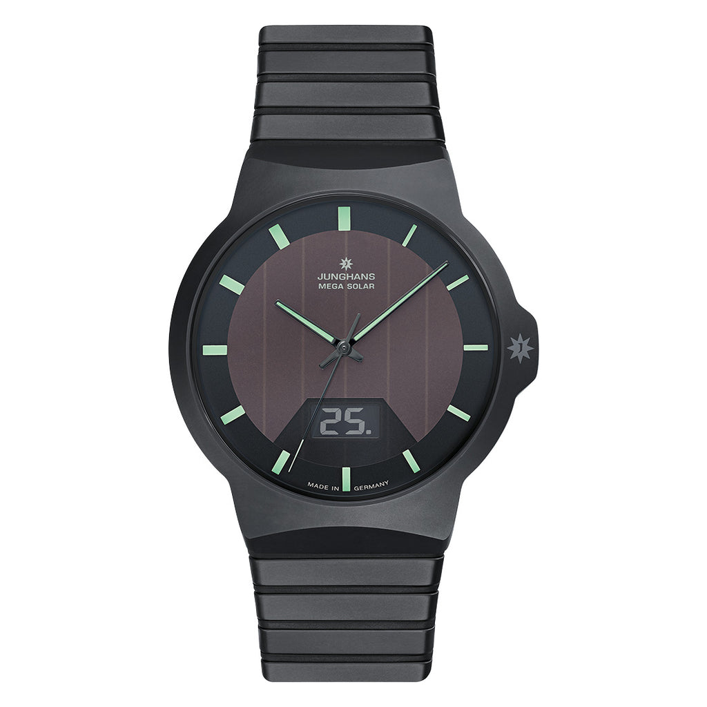 Maximum precision in classy ceramics: As well as combining radio technology with solar technology, the Force Mega Solar also incorporates the design with wear comfort and scratch resistance. With radio-controlled watches still offering the most precise time display today, this timekeeper is 100% reliable as a companion in any given situation. Adjustment is possible using the Junghans MEGA App