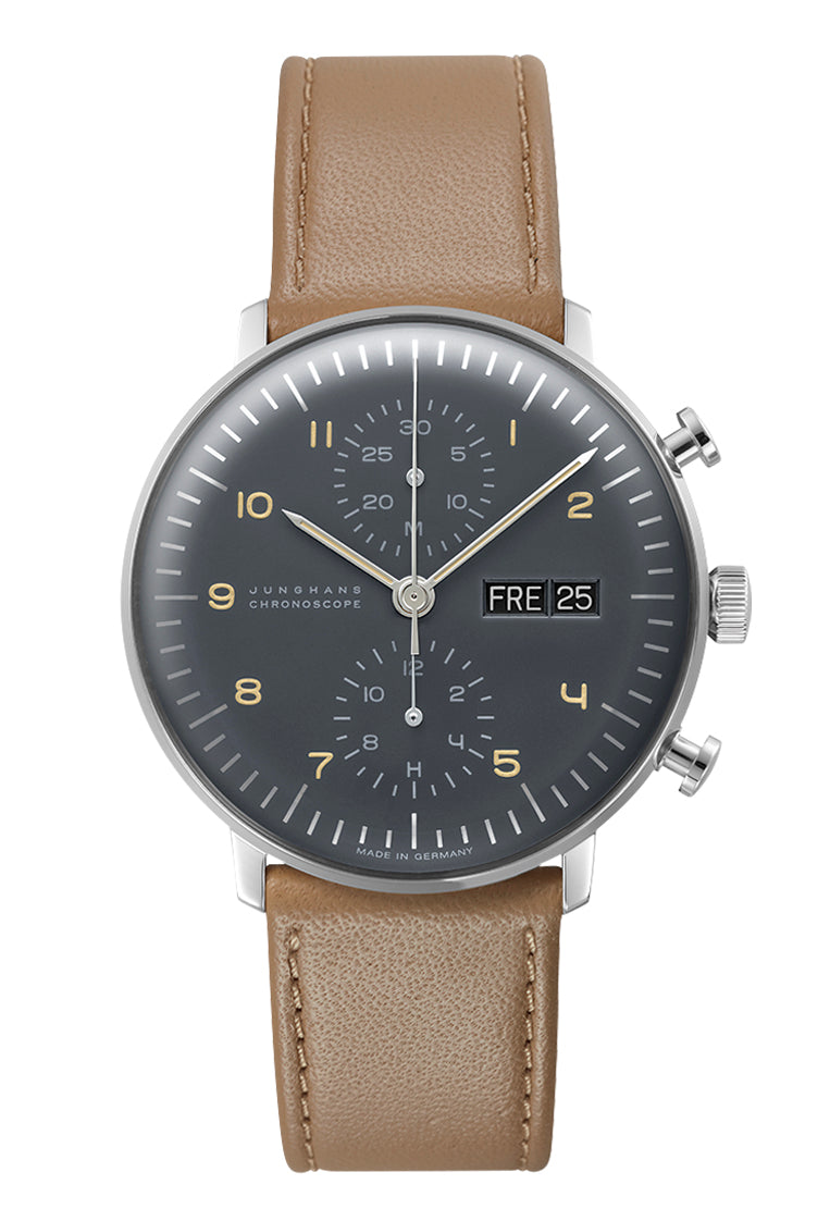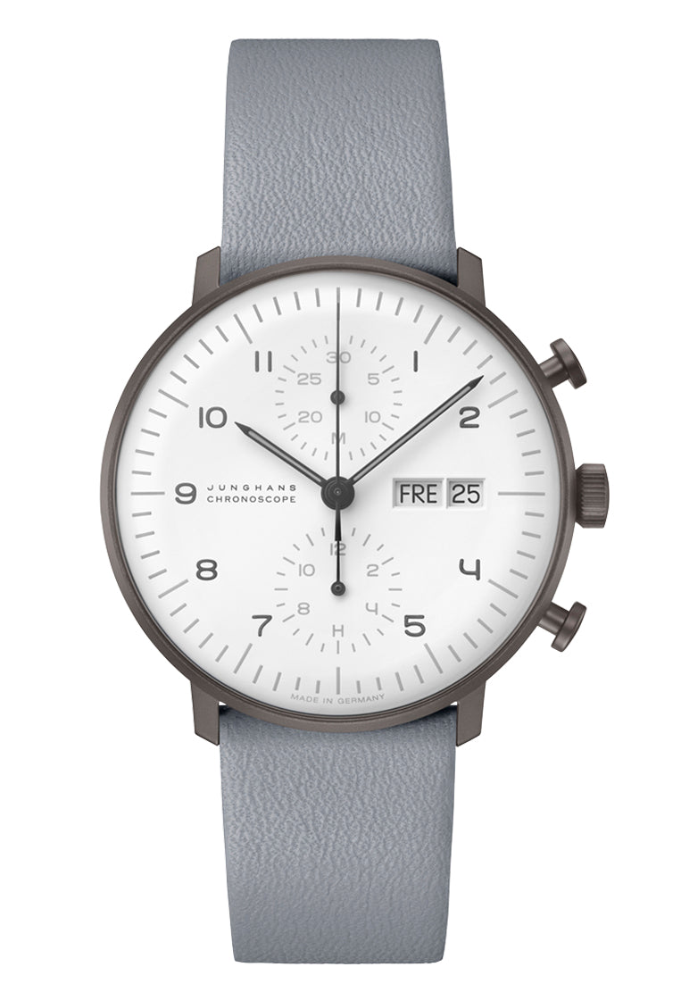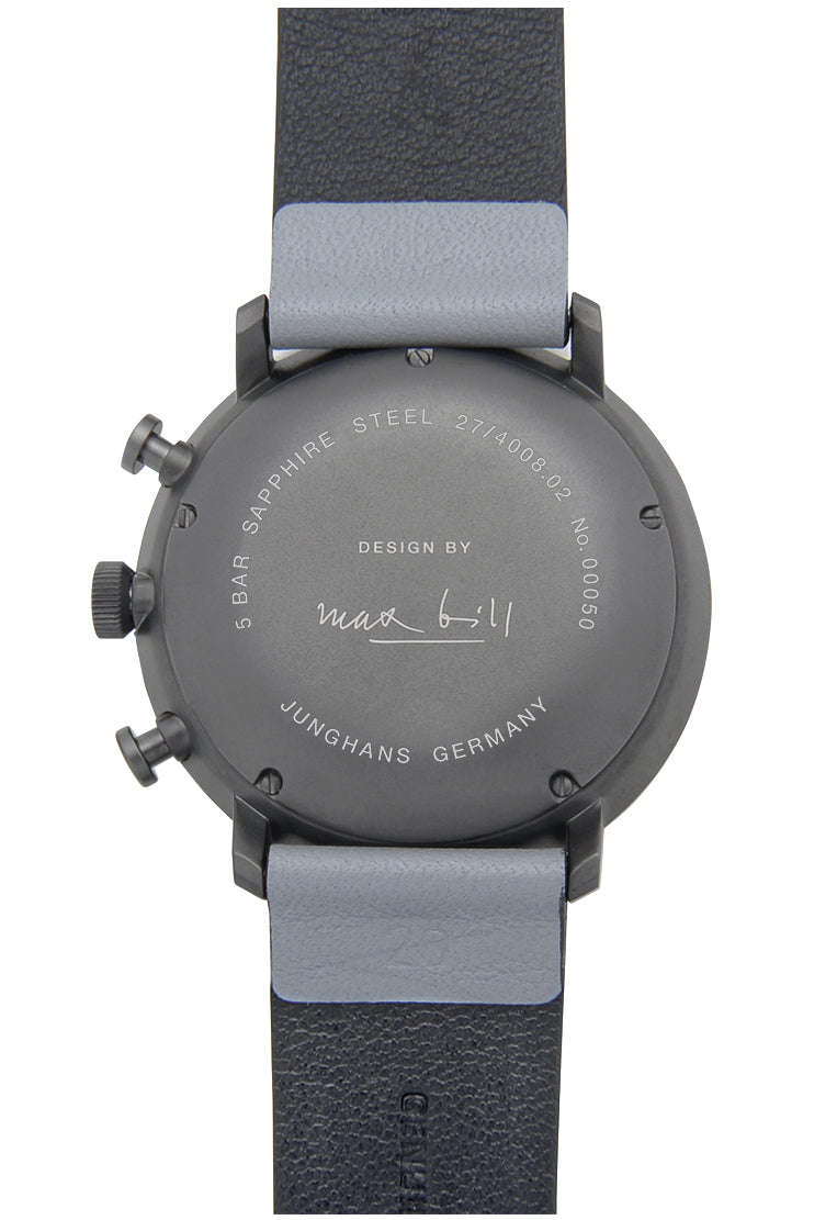 As with all pieces in this collection, the design of the mechanical max bill Chronoscope is highly impressive due to its focus on the bare essentials. This is clearly evidenced in the plain, minimalistic design of the Dial. Relinquishing display of the small seconds creates a particularly striking symmetry.