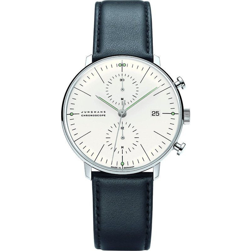 His work is characterized by a clarity of design and precise proportions which are unrivaled to this day, and in 1962, Max Bill created mechanical wristwatches for Junghans. These impressive timepieces are renowned not only for their aesthetic design, but also their precision. Now, these exceptional and exclusive models have been revived by Junghans with their original Max Bill design. This Max Bill Chronoscope Watch features an Automatic Movement with Chronograph Function, cleanly legible numerals on a polished white face which also displays the date, and is completed with a beautiful black calfskin leather band.