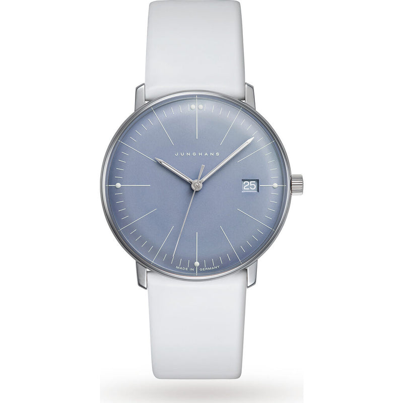Junghans Max Bill 047/4659.00 ladies in the version. This is one of the newest additions to the Max Bill Ladies line of watches. Product designer Max Bill left behind an extensive life's work, including one of the most fascinating watch collection by Junghans. A lovely white calfskin strap and ice blue coloured hands with environmentally friendly luminous substance. Superior timekeeping, style and versatility are what you can expect from this hand wound Max Bill watch. Beautiful modern display, stainless steel case complete the look.