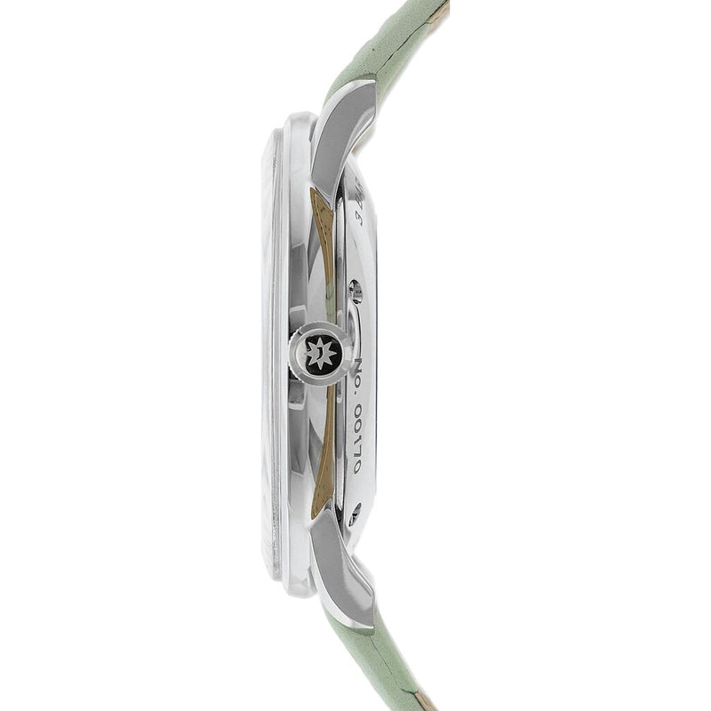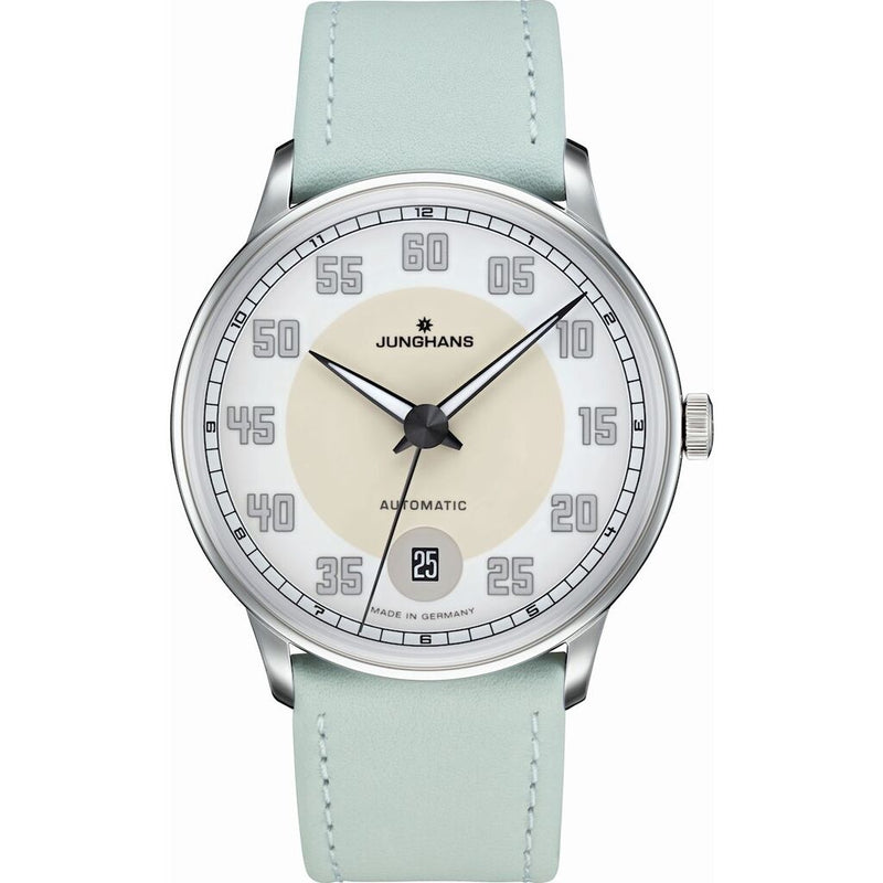 Junghans Watch Meister Driver Automatic 027/4717.00. The Master Driver not only displays the time but brings back a whole era: the early years of the modern automobile and the hour of the great technology pioneers. Like no other, Meister Driver combines the unique charm of these automobiles with our passion for mechanical timepieces. Like most Junghans watches, this Junghans Meister Driver Automatic watch uses a special convex hard Plexiglass with a SICRALAN coating which strengthens the glass and improves its scratch resistance. Plexiglass the glass, a stunning white and sand coloured lacquer dial is set with stainless steel hands that have been painted in a luminous substance the Arabic numerals are decorated in a gorgeous mint green that beautifully matches the leather strap.