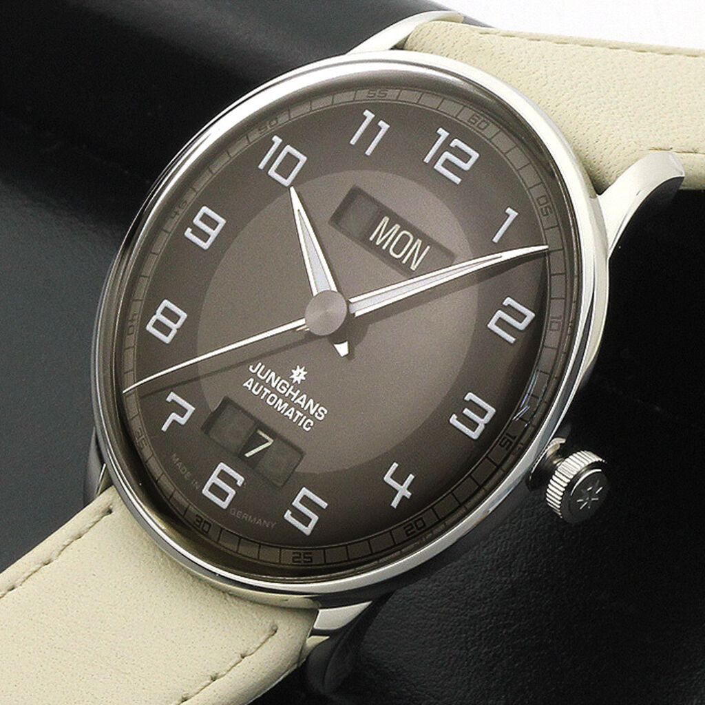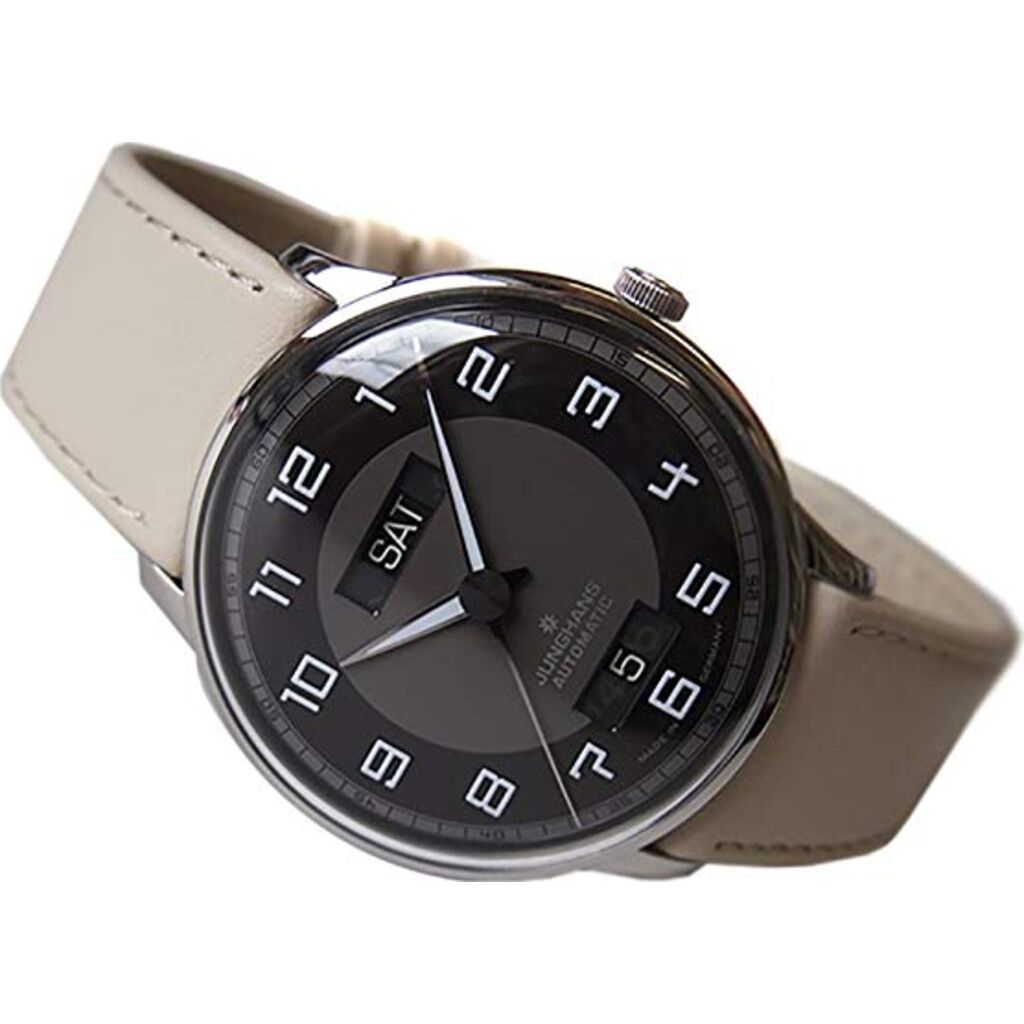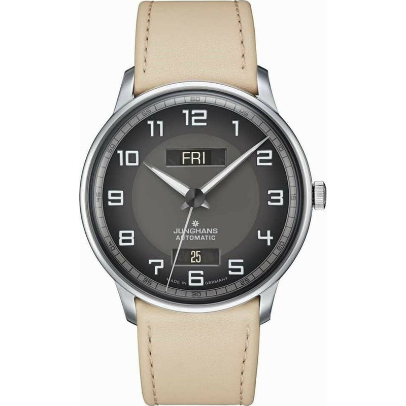 The Junghans Meister Driver Day Date 027/4721.01 is an absolutely stunning, gorgeous watch. The end result is breathtaking beauty. Under the hood you will find the mechanical (automatic) movement Junghans Cal. J800.4, which is of course Swiss Made. This movement has fascinating day and date complications where you can see the day below the 12 o'clock marker and the date above the 6 o'clock marker. The glass is convex hard Plexiglass with a SICRALAN coating which strengthens the glass and improves its scratch resistance. Beneath the glass, a stunning anthracite grey lacquer effect dial is set with stainless steel hands and appliques that have been painted in a luminous substance. To complete the look, a sand calfskin leather strap and stainless steel buckle is added. This model features a day display, date display and automatic movement.