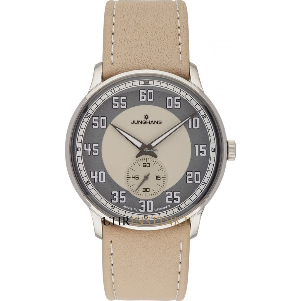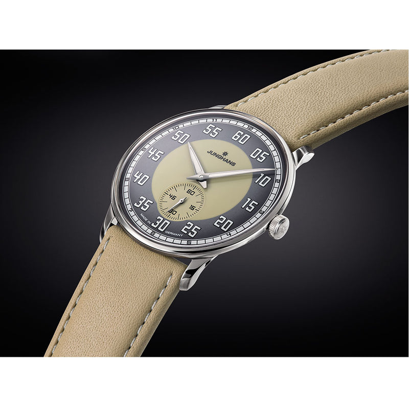 Junghans Meister Driver 027/3608.00. Not only does the Meister Driver display the time, it also evokes an entire era: the early years of modern motoring, a time of great technological pioneers. Like no other watch, the Meister Driver combines the distinctive charm of these automobiles with our passion for mechanical timepieces. This expertly crafted hand-wound watch represents a time of the early years of motoring. Sand and grey coloured effect lacquer dial, appliques and hands with environmentally friendly luminous substance with a leather strap and stainless steel case. Small Seconds at 6 o'clock and luminous numerals and hands.