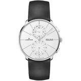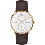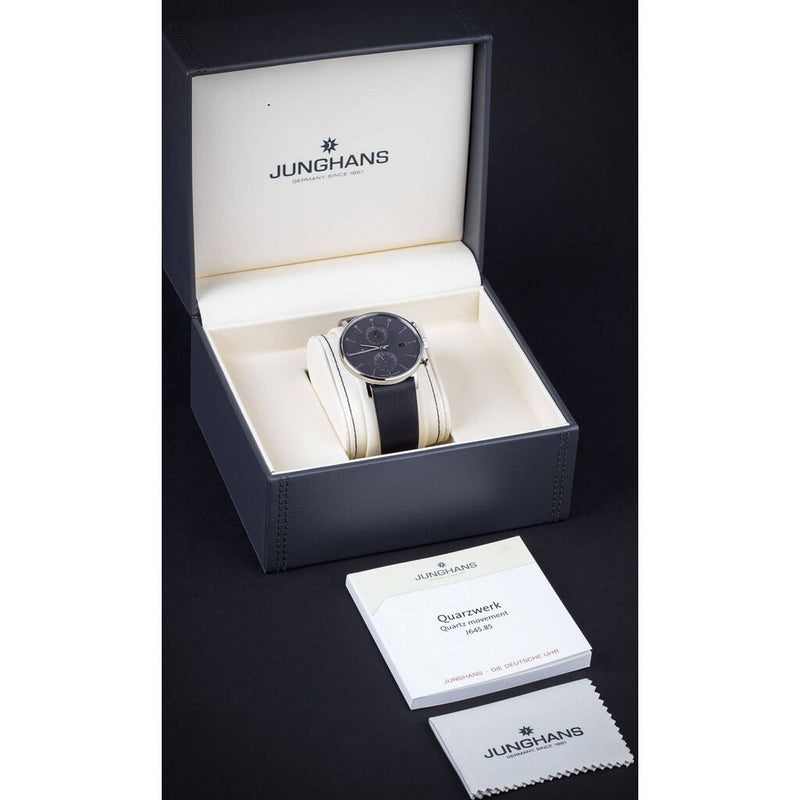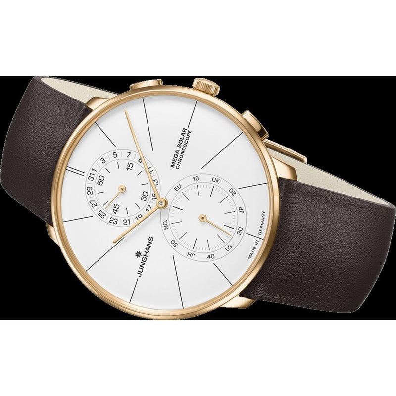 Elevate your style with the Junghans Meister fein Chronoscope MEGA Solar. This exquisite timepiece seamlessly blends traditional craftsmanship with cutting-edge technology. Its sleek, 39.5 millimeter stainless steel or rose gold PVD case, paired with a domed sapphire crystal, exudes timeless elegance. The solar-powered Connected RC movement ensures precision and efficiency, while the Junghans MEGA app syncs your watch effortlessly. With a dark power reserve of up to 3 years, perpetual calendar, and radio reception in multiple regions, this watch is as reliable as it is sophisticated. Whether you're in the boardroom or out on the town, make a statement with this masterpiece on your wrist.