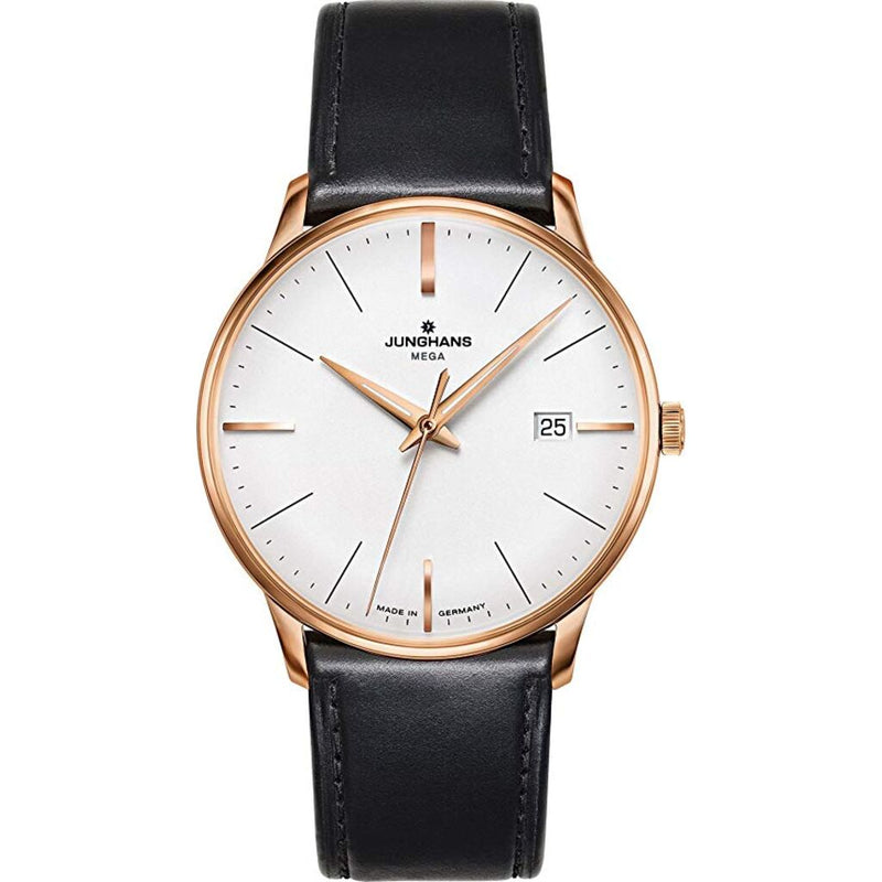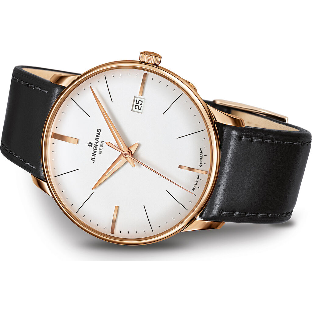Junghans Watch Meister Mega Kleine Sekunde 058/7800.00. The Meister label has stood for classic watchmaking at Junghans since 1936. In keeping with this tradition, the present-day Meister watches are characterised by a passion for precision and a distinctive awareness of quality. The latest generation of radio-controlled watches represents a further milestone. The Meister Mega unites traditional design with precise technology. A unique combination of design, style and accuracy. This watch puts your outfits on another level with remarkable sophistication and a design so crisp that you cannot stop admiring. Material of the case is PVD rose plating, matt silver dial and black luxury horse leather strap in a tone that shimmers deeply and distinctively. Beneath the surface, a radio-controlled movement keeps track of time and adjusts as you go, making the desirability and convenience another notch higher. Features a date display, isolated second hand and radio-controlled movement.