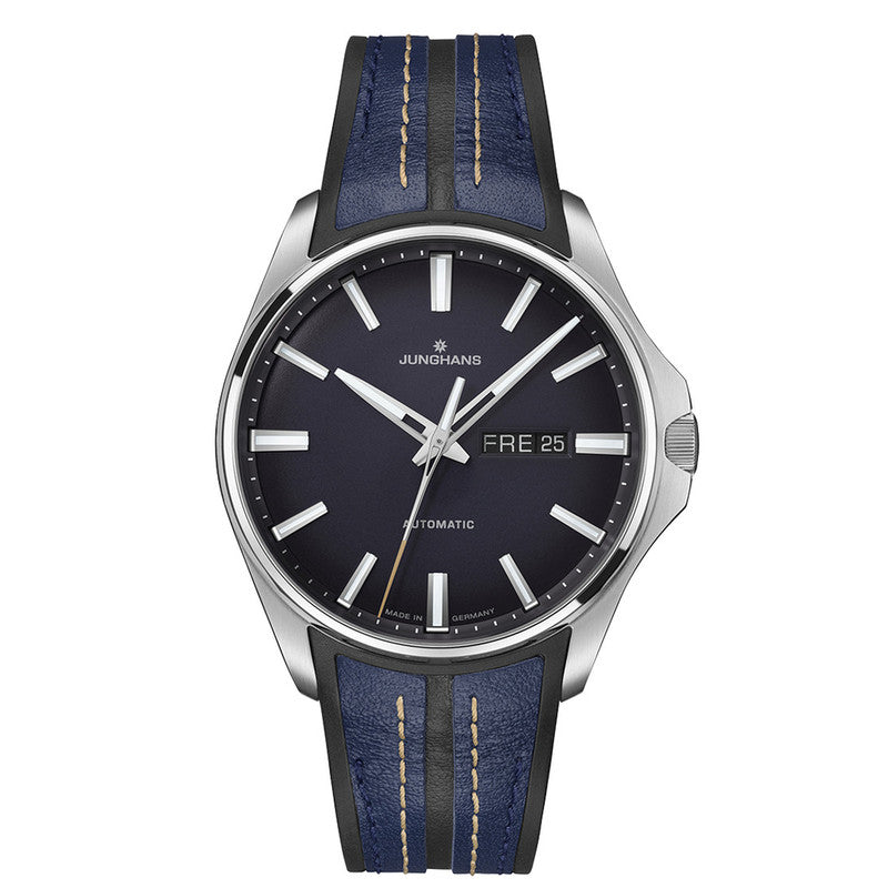 The Junghans Meister S Automatic Watch combines timeless elegance with robust functionality. Encased in stainless steel with a midnight blue dial featuring a subtle olive green effect, it offers a blend of style and practicality. Its self-winding automatic movement ensures precision, while the anti-reflective sapphire glass and luminous hands enhance readability. With a 40.5mm case, 38-hour power reserve, and 20-bar water resistance, this watch is suited for any occasion, from professional settings to sports and leisure. The choice between a black synthetic rubber strap and a stainless steel bracelet provides versatility to match your personal style.