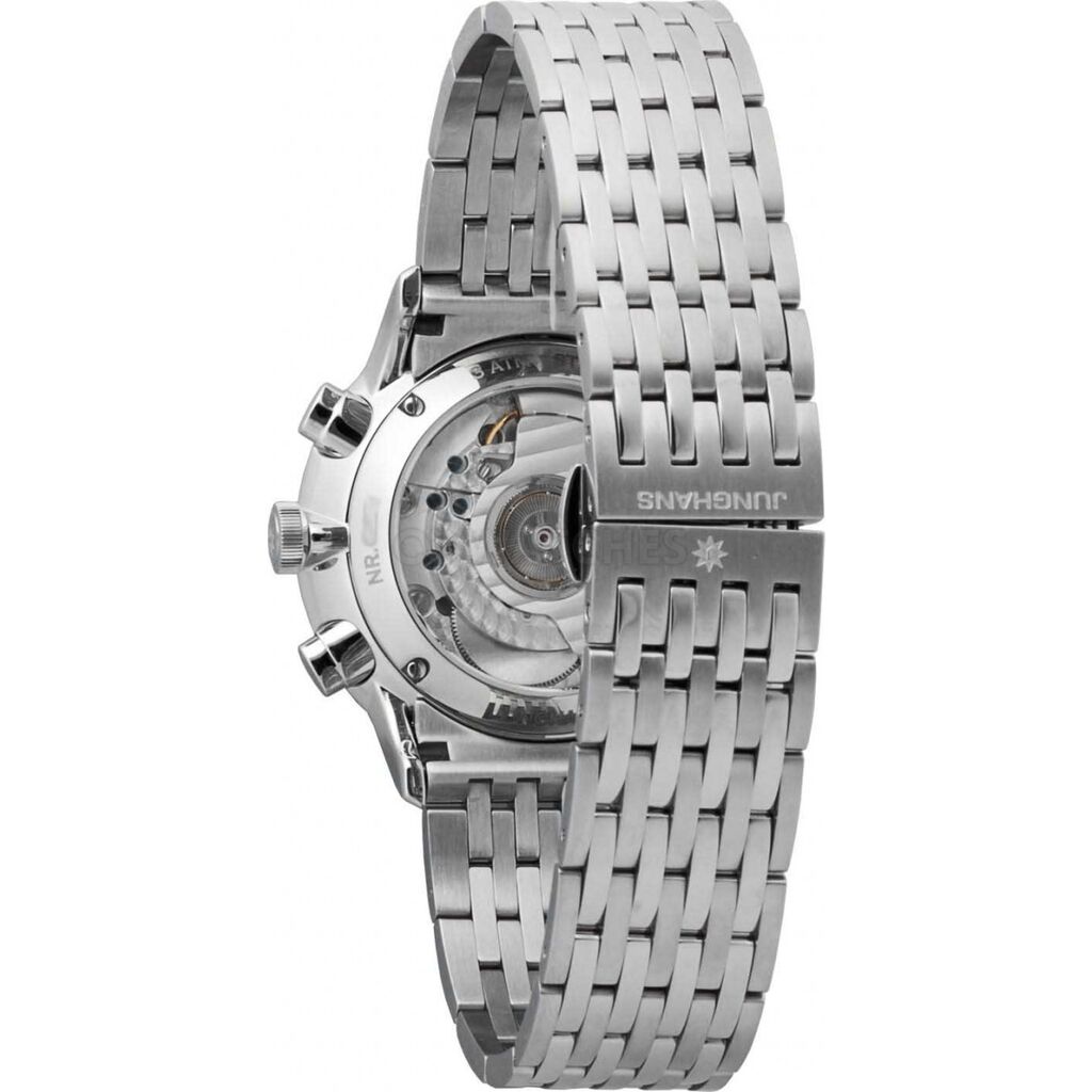 The Junghans Meister Telemeter 027/3381.44 is a classic, mechanical (automatic) bi-compax chronograph. Under the hood you will find the Junghans Cal. J.880.3, which is based on an ETA 2892. The plexiglass glass has a high dome and a durable sicralan coating. This coating helps protect the otherwise relatively vulnerable plexiglass against scratches. The Telemeter pays homage to classic chronograph watches but does so with several modern upgrades. The movement is highly reliable and the case has a nice all-round diameter of 40.8mm (without the crown) which makes it suitable for nearly any wrist. This unique self winding chronoscope watch shows bold numerals against the polished black face. A stainless steel band and case finishes this watch with a classic style.