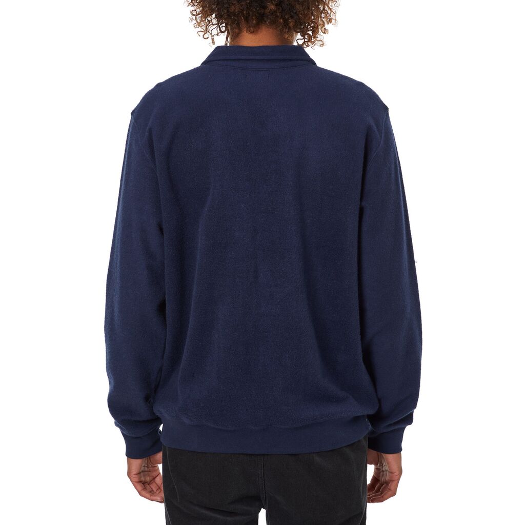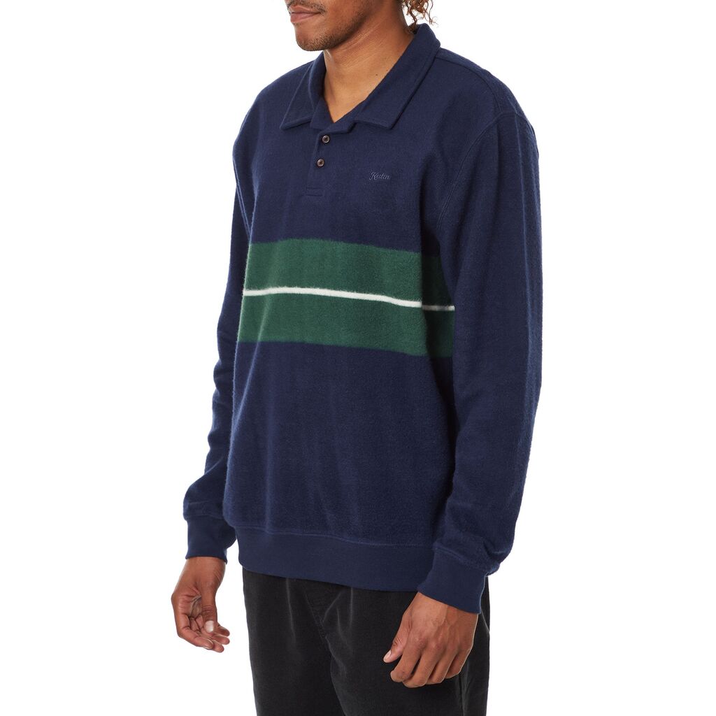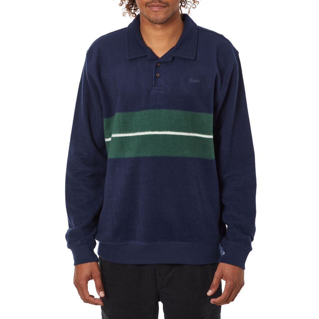 The Laural Fleece Polo is made from a heavily brushed custom yarn dyed stripe knit and features a Katin script embroidery on the left chest and a two button placket with collar.