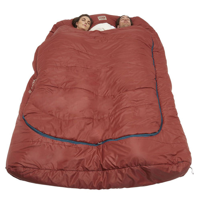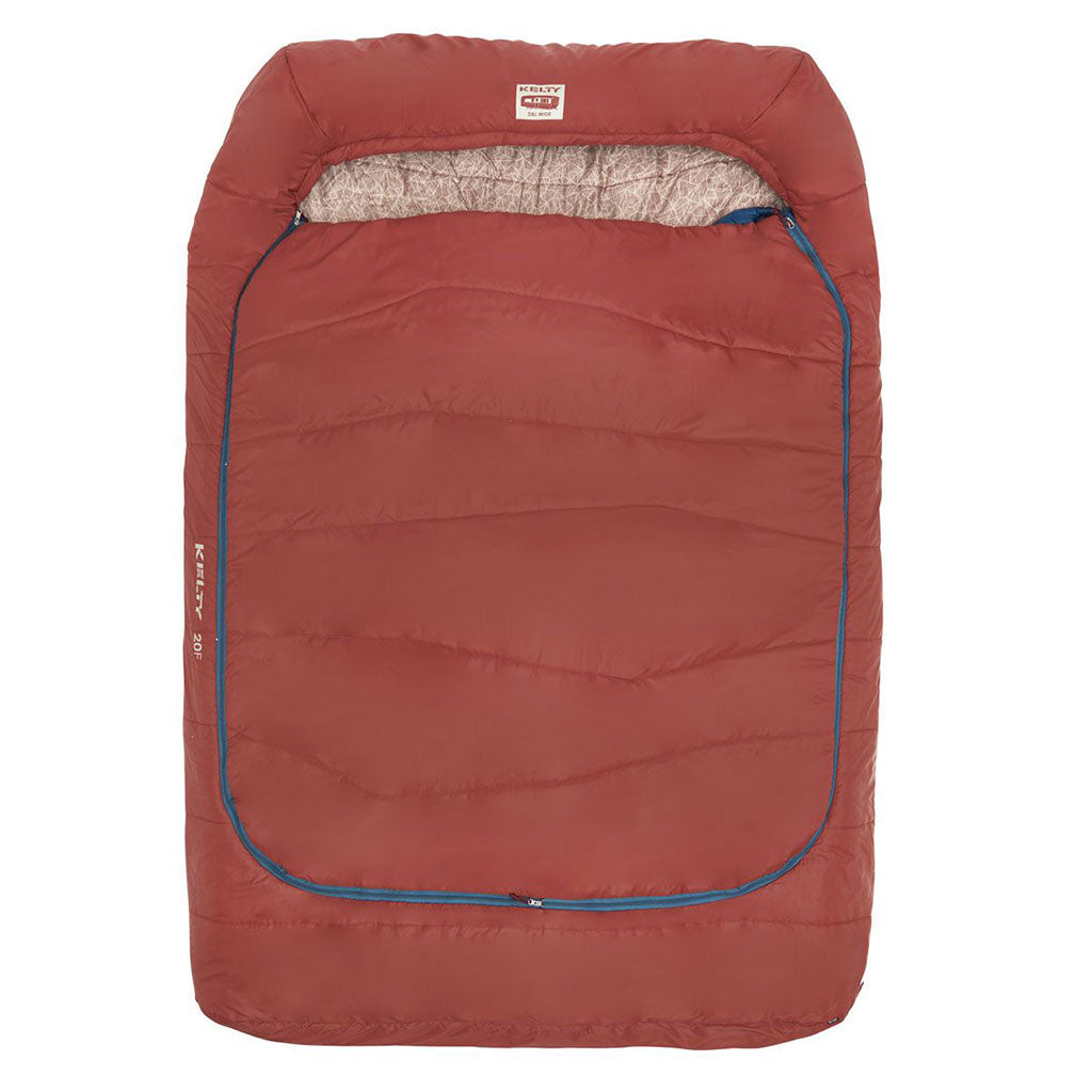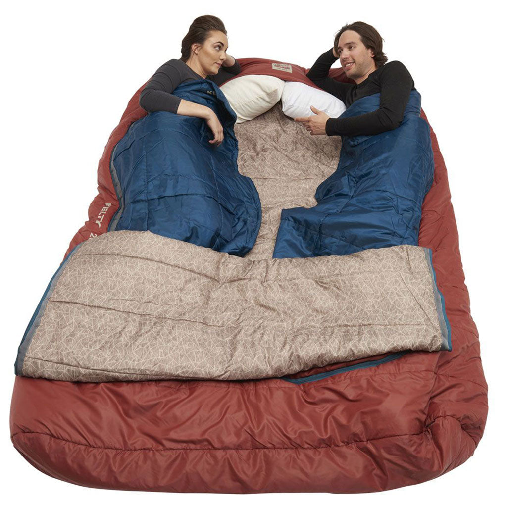Whether you're snoozing or snuggling, you want two things from your sleeping bag: contact with bae, and control over your temperature. Our Doublewide lets you do you...times two. Wider than a standard double with a hood that accommodates two standard-sized pillows, the Tru.Comfort Doublewide also gives each person their own personal snuggle blanket and foot vent. Not in the mood for ZZZs? The Doublewide is the best way to get down without getting dirty in the outdoors. The Kelty Tru.Comfort Doublewide 20F is a two person sleeping bag for all those camping couples forced to choose between combining sleeping bags and cuddling or staying warm. This two-person sleeping bag offers all the comfort and warmth of Kelty's signature Tru.Comfort brand and without the feeling of suffocation you might get from a standard sleeping bag. It also has two inner linings that you can use for added warmth.