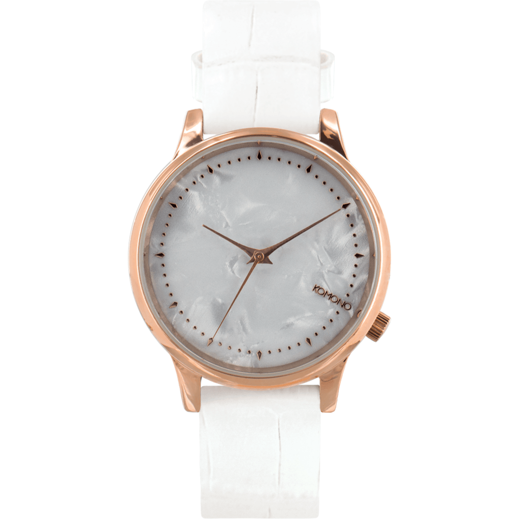 Exotic, distinguished, classic white with a hint of gold. Komono designed the Estelle with a the world of It-bags in mind. The Estelle Monte Carlo is a unique watch that stands in extravagance, yet subtlety in its own class. The watch, designed with a genuine leather wristband, is the perfect luxurious indulgence for any wrist. Featuring Japanese Quartz movement, the Estelle Monte Carlo has a glossy metal case with a stainless steel back and is water resistant for up to 3 atm.