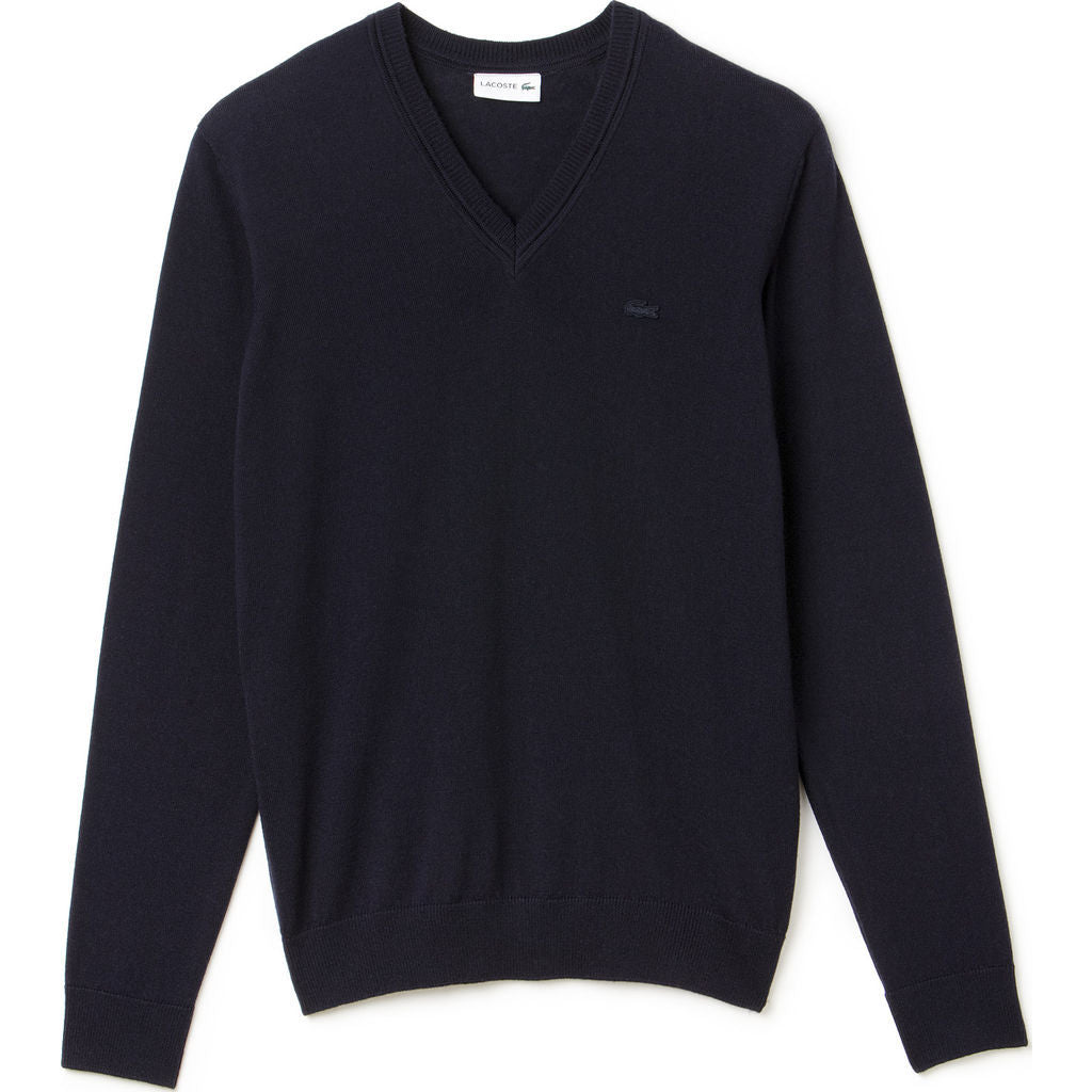 Crafted in rich wool, Lacoste's V Neck Jersey Sweater boasts elegance and class with its refined appearance, lustrous feel and unparalleled warmth. Easy to coordinate with and timelessly charming, this navy blue wool sweater can add some sophistication to any wardrobe.